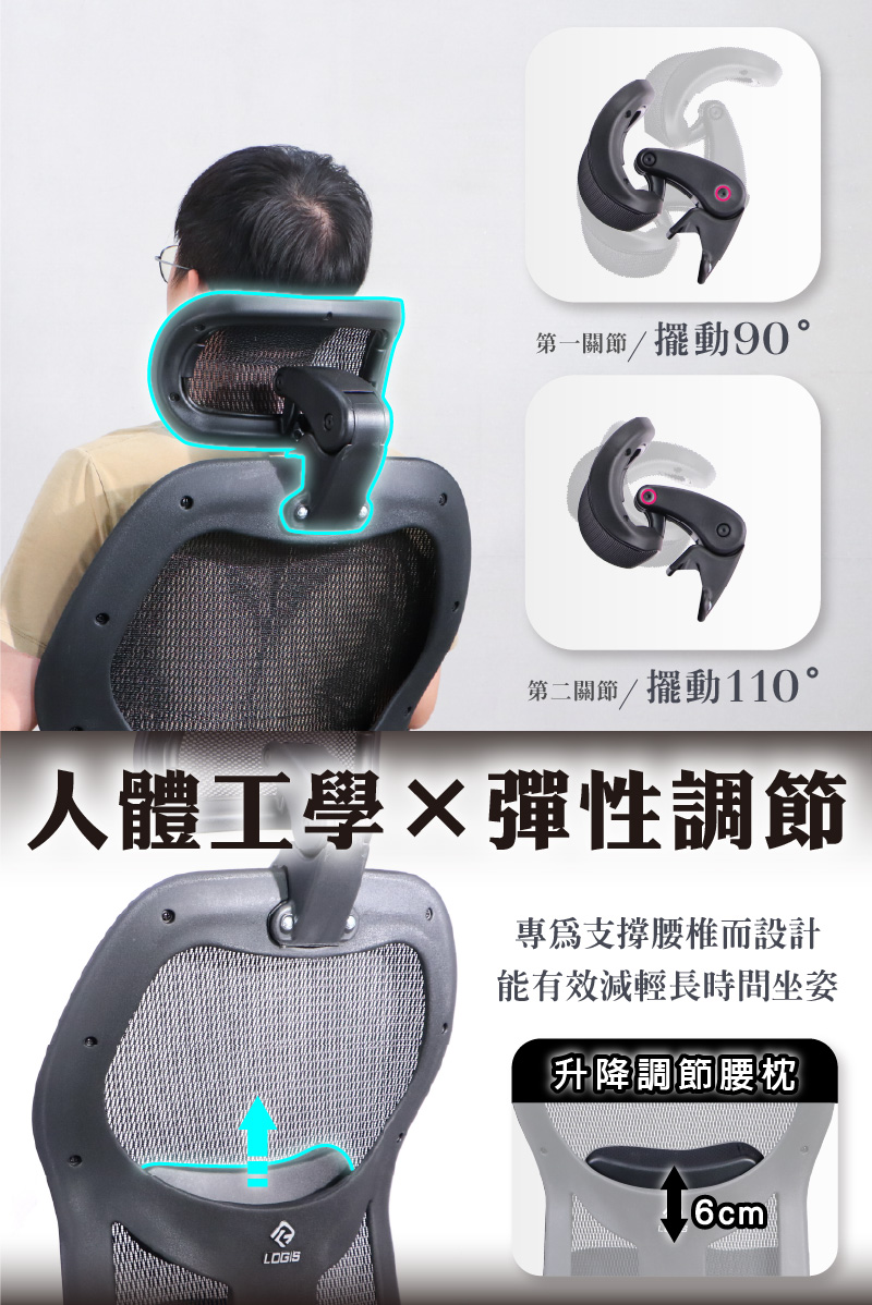 ✔ 新型專利全方位頭枕:兩段式關節旋轉,可依據身高與頸部舒適度做調節。