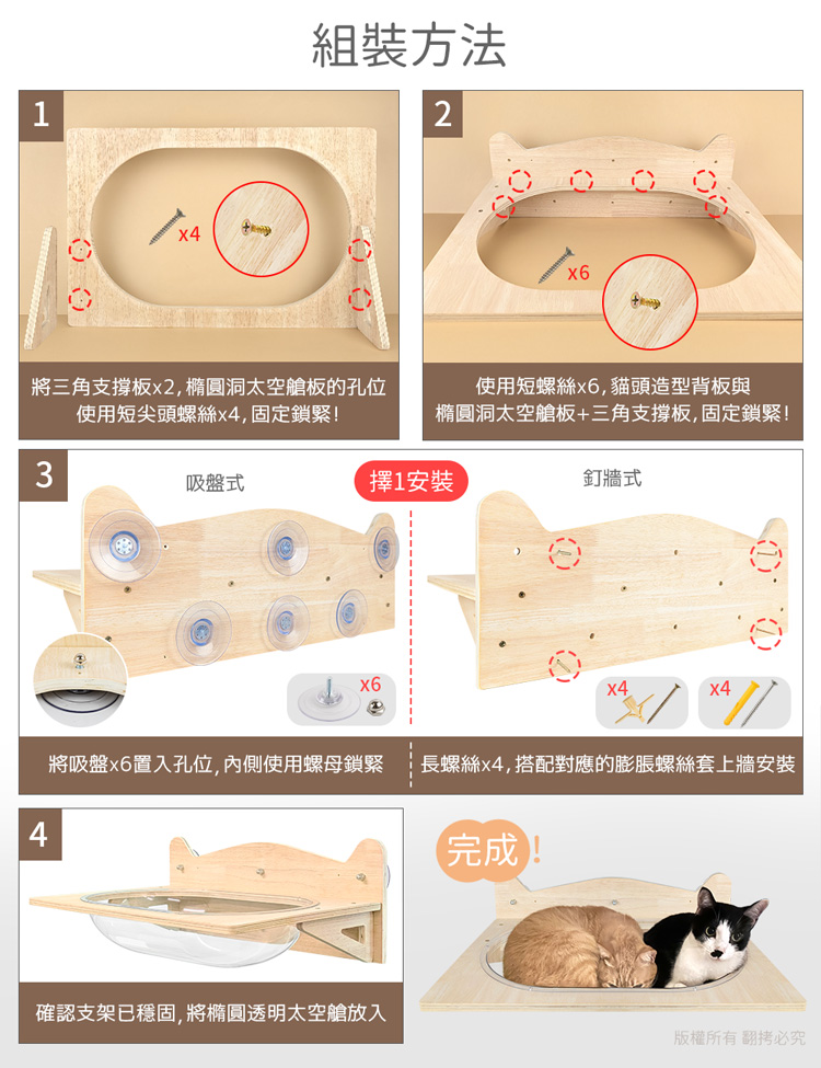 .釘牆時請留意,請勿太靠天花板/桌邊牆角。避免貓咪在跳躍過程中撞傷。