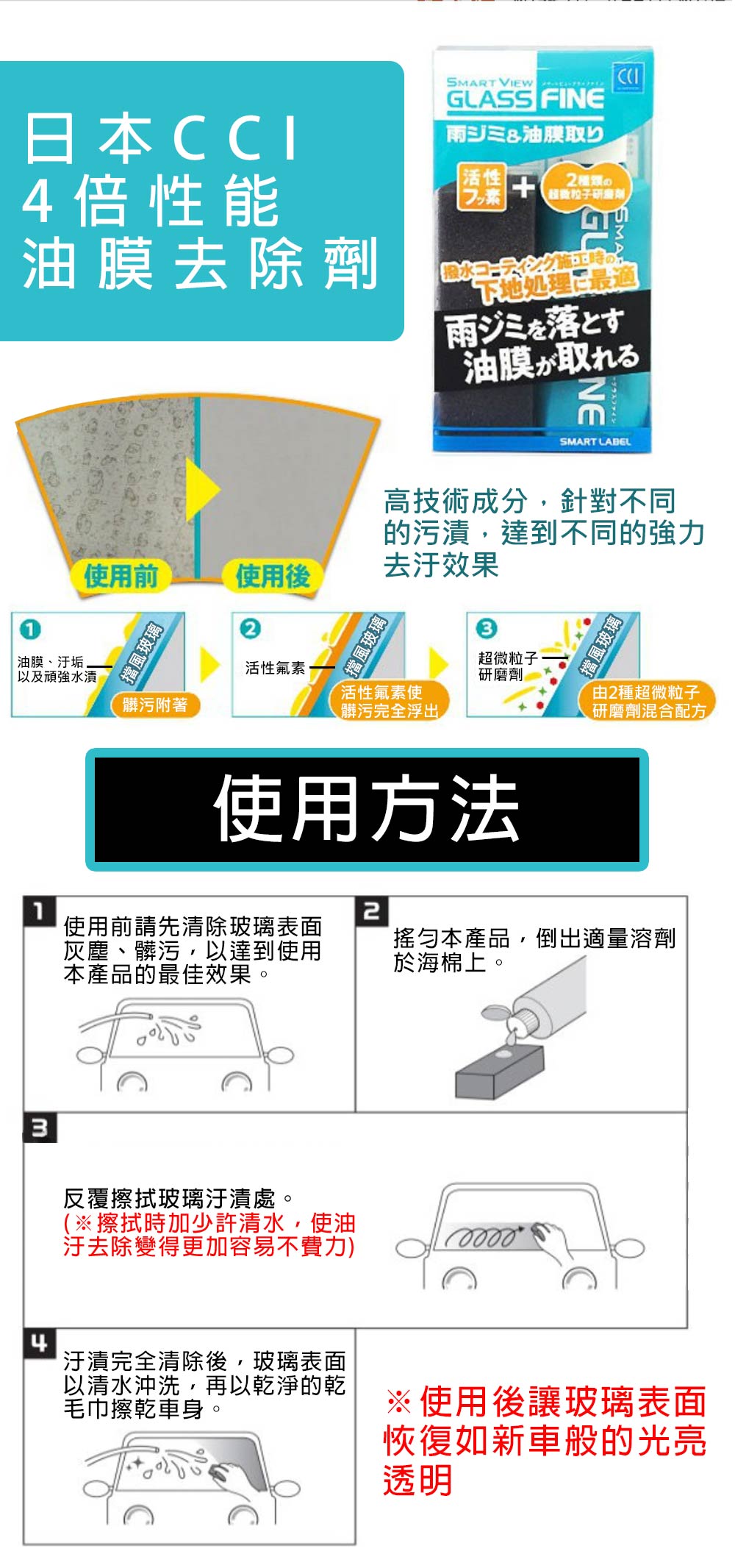 ‧日本CCI獨家配方,由活性氟素 2種超微粒子研磨劑混合配方。‧強力有效去除玻璃上的油膜、汙垢以及頑強水漬。‧高技術成分,針對不同的汙垢,達到不同的去汙效果。‧使用後讓玻璃表面恢復如新車般的光亮透明。‧附贈研磨用海綿,使超微粒子研磨成份發揮最大效能,輕鬆完成作業。‧日本CCI優質產品,讓您使用更加安心。