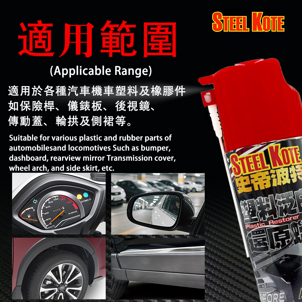 適用範圍 : 適用於各種汽車機車塑料及橡膠件如保險桿、儀錶板、後視鏡、傳動蓋、輪拱及側裙等。