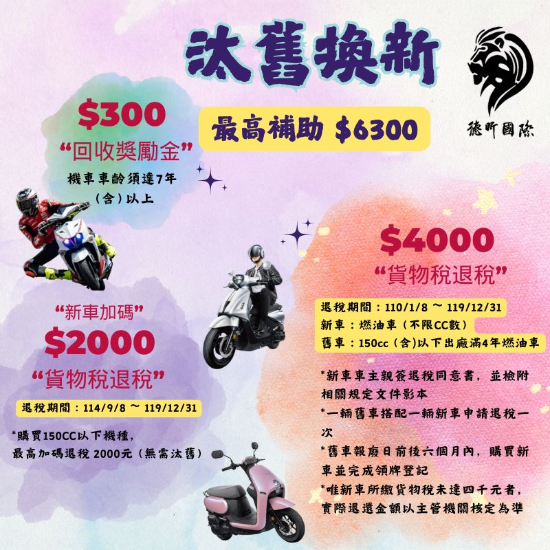 ★ 專業機車托運免運費*外島除外*新竹(含)以北會約時間送到府以南會寄託運到附近車行或者到府取車宜蘭花蓮台東地區和較偏遠地區 會寄託運到附近車行取車◎ 售價*不含*領牌規費和強制險費用!!◎ 訂購後將有專人致電確認領牌事項和送車相關問題!◎ 現在皆無紙化,無紙本說明書/保固書-車廂內有一個QR扣掃進去就是唷!◎ 訂購前,請仔細閱讀購車注意事項,以確保權益!◎ 新機車屬於財產登記制,一經領牌,不在是新車,皆無法退換貨, 若欲退貨.須負擔車輛折舊40%損失,並請您確保機車原狀(無使用過狀態)若有缺配件/使用過,將依缺件商品價格/使用程度折損收取費用.