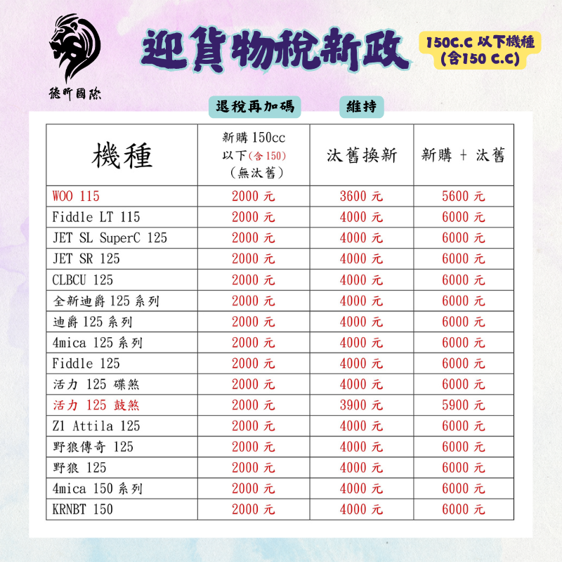 ★ 專業機車托運免運費*外島除外*新竹(含)以北會約時間送到府以南會寄託運到附近車行或者到府取車宜蘭花蓮台東地區和較偏遠地區 會寄託運到附近車行取車◎ 售價*不含*領牌規費和強制險費用!!◎ 訂購後將有專人致電確認領牌事項和送車相關問題!◎ 現在皆無紙化,無紙本說明書/保固書-車廂內有一個QR扣掃進去就是唷!◎ 訂購前,請仔細閱讀購車注意事項,以確保權益!◎ 新機車屬於財產登記制,一經領牌,不在是新車,皆無法退換貨, 若欲退貨.須負擔車輛折舊40%損失,並請您確保機車原狀(無使用過狀態)若有缺配件/使用過,將依缺件商品價格/使用程度折損收取費用.