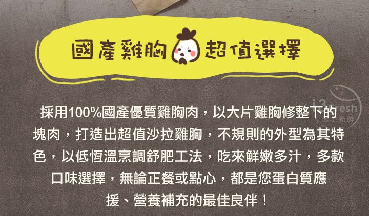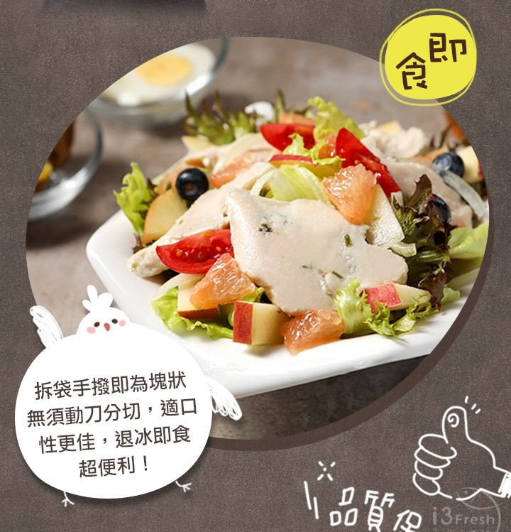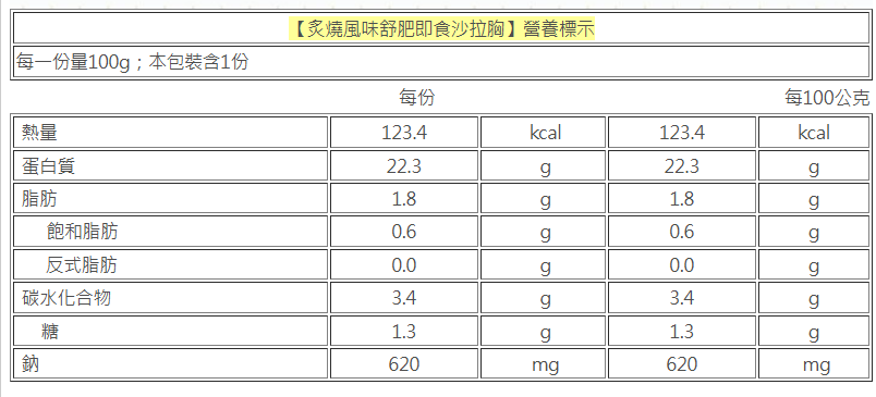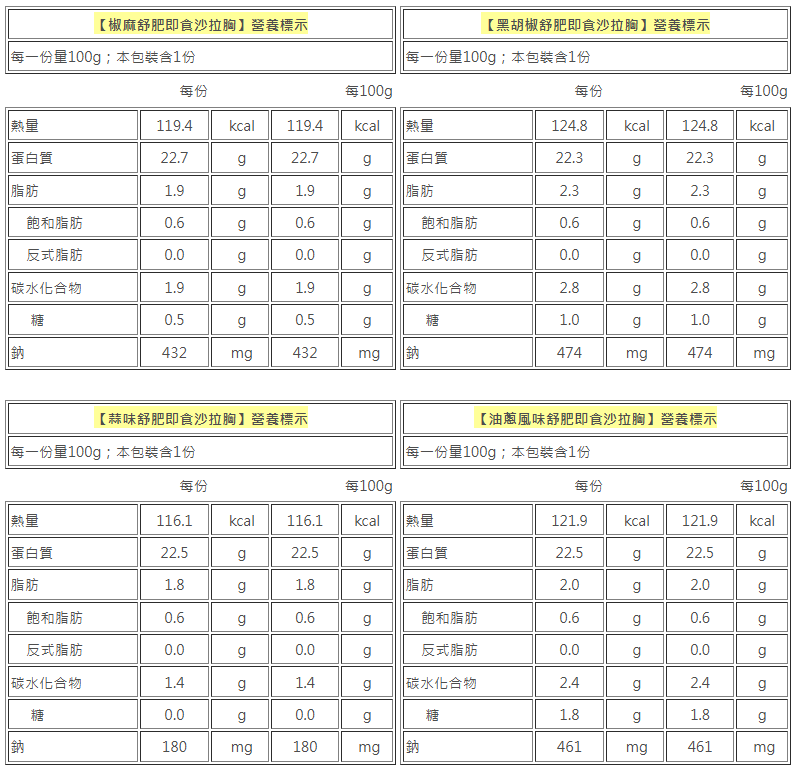 【炙燒風味舒肥即食沙拉胸】 商品成分:雞肉、炙燒調味料(糖、太白粉(樹薯澱粉)、鹽、玉米澱粉(非基因改造)、多磷酸鈉(結著劑)、大蒜、洋蔥、白胡椒、木糖、味精(調味劑)、胺基乙酸(調味劑)、DL-胺基丙酸(調味劑)、琥珀酸二鈉(調味劑)、5’-次黃嘌呤核苷磷酸二鈉+5’-鳥嘌呤核苷磷酸二鈉(調味劑)、桂枝、八角、小茴香、山奈、丁香、碳酸氫鈉(膨脹劑)、麥芽糊精、蔗糖素(甜味劑)、肉桂、香料(大豆油、芝麻油、洋蔥油、香料、維生素E(抗氧化劑))、乙基麥芽醇(香料))、鹽、白胡椒粉 【黑胡椒舒肥即食沙拉胸】 商品成分:雞肉、黑胡椒香料(玉米澱粉-非基改、味精(調味劑)、大蒜、洋蔥、碘鹽、木糖、多磷酸鈉(結著劑)、白胡椒、黑胡椒、碳酸氫鈉(膨脹劑)、胺基乙酸(調味劑)、DL-胺基丙酸(調味劑)、琥珀酸二鈉(調味劑)、5’-次黃嘌呤核苷磷酸二鈉+5’-鳥嘌呤核苷磷酸二鈉(調味劑)、蔗糖素(甜味劑)、香料)、醬油(水、非基因改造脫脂大豆片、小麥、食鹽、酒精)、糖、香油(大豆油、芝麻油)、食鹽、品質改良劑(多磷酸鈉、無水焦磷酸鈉)、白胡椒粉 【蒜味舒肥即食沙拉胸】 商品成分:雞肉、蒜頭、米酒、食鹽、白胡椒粉 【油蔥風味舒肥即食沙拉胸】 商品成分:雞肉、糖、鹽、油蔥香料(香料、中鏈三酸甘油酯)、珠蔥片 【椒麻舒肥即食沙拉胸】 商品成分:雞肉、椒麻醃漬料{碘鹽、味素(調味劑)、樹薯澱粉、黑胡椒粉、花椒粉、五香粉(胡椒粉、八角粉、肉桂粉、甘草粉、小茴香粉)、雞心椒粉、中粗黑胡椒粒、醬油粉[純釀造醬油、麥芽糊精、味精(調味劑)、琥珀酸二鈉(調味劑)、5’-次黃嘌呤核苷磷酸二鈉(調味劑)、5’-鳥嘌呤核苷磷酸二鈉(調味劑)]、多磷酸鈉(品質改良劑)、焦磷酸鈉(品質改良劑)、關華豆膠、辣椒碎、油性辣椒精(辣椒精、脂肪酸甘油酯)、花椒精油(花椒萃取物)} 【共同資訊】 商品重量:100g±4.5g 商品產地:台灣 保存期限:一年(未拆封條件下) 保存方式:冷凍於-18℃以下 過敏原:本產品生產製程廠房,其設備或生產管線有處理大豆、芝麻、含麩質之穀物、甲殼類、牛奶、堅果類及其製品。 食用方式:※可解凍拆封即食,亦可覆熱風味更佳※ 1.產品為冷凍狀態時,隔水加熱6-8分鐘,熱水不要沸騰,回溫後即可食用。 2.產品可置於冷藏室退冰後,隔水加熱4-6分鐘,熱水不要沸騰,回溫後即可食用。 3.使用家用型800W微波爐不需解凍,微波爐以中小火加溫,正反兩面各1-2分,至表面微溫為最佳口感。 注意事項:本公司產品生產、儲存、運送均採低溫處理,商品請勿反覆解凍食用。