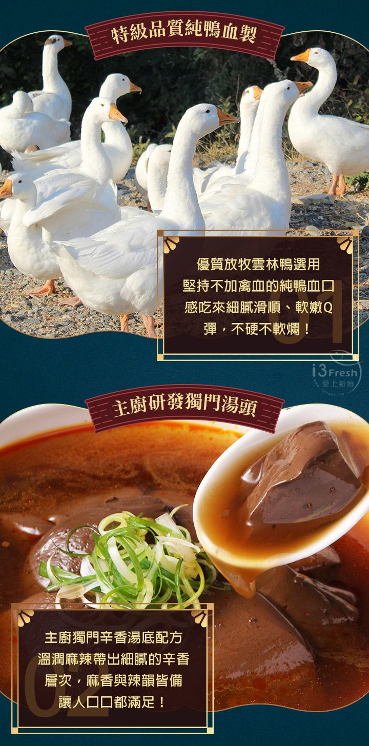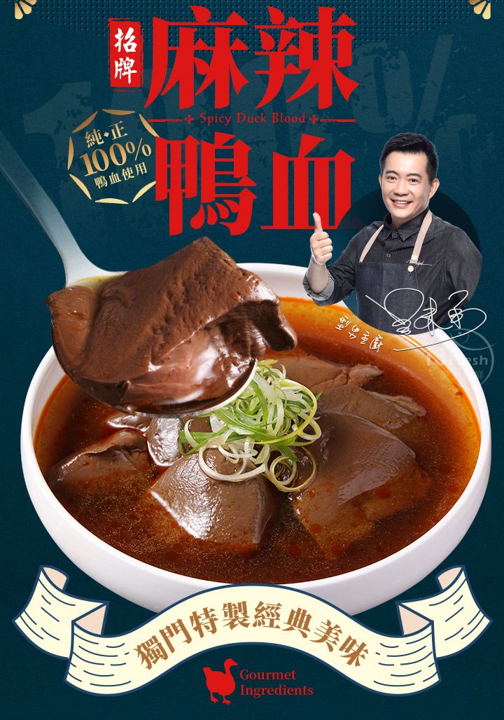 嚴選東勢優質鴨隻,100%純鴨血製作絕不摻雜豬血或雞血,鴨血細嫩滑口富有彈性,搭配特調黃金比例麻辣湯底,獨門香氣香麻溫潤,饕客必嚐!