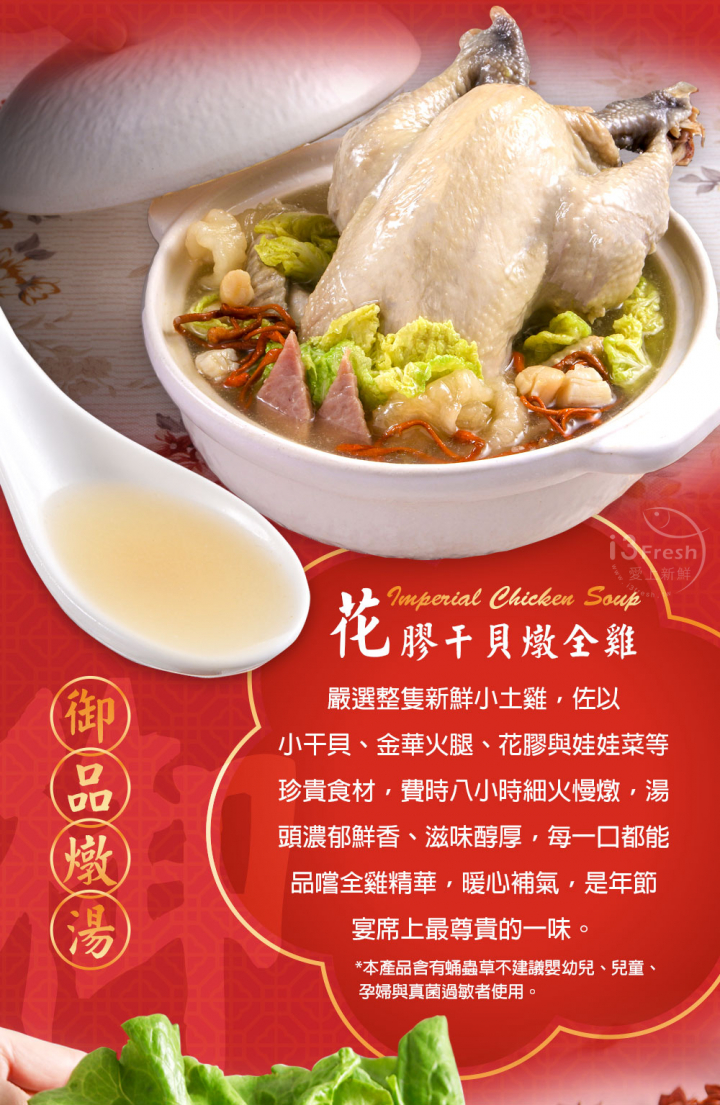 商品成分:雞高湯(水、雞骨(台灣)、豬大骨(台灣)、濃縮鮮雞汁(水、鹽、雞肉萃取物(雞肉萃取物、鹽)、L-麩酸鈉、糖、雞油、酵母萃取物(酵母萃取物、鹽)、乙醯化己二酸二澱粉、香料、調味劑(5'-次黃嘌呤核苷磷酸二鈉、5'-鳥嘌呤核苷磷酸二鈉))、明膠(來源:豬皮萃取物)、玉米糖膠、β-胡蘿蔔素(麥芽糊精、辛烯基丁二酸鈉澱粉、葵花籽油、抗氧化劑(L-抗壞血酸鈉、維生素C、維生素E)、β-胡蘿萄素))、小土雞、娃娃菜、花膠、小干貝、金華火腿(豬肉(台灣)、精鹽、亞硝酸鈉(0.07g/kg以下))、蛹蟲草子實體(Cordyceps militaris,固態培養)、糖、鹽