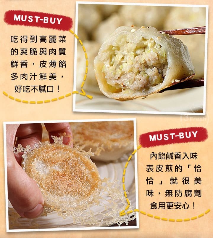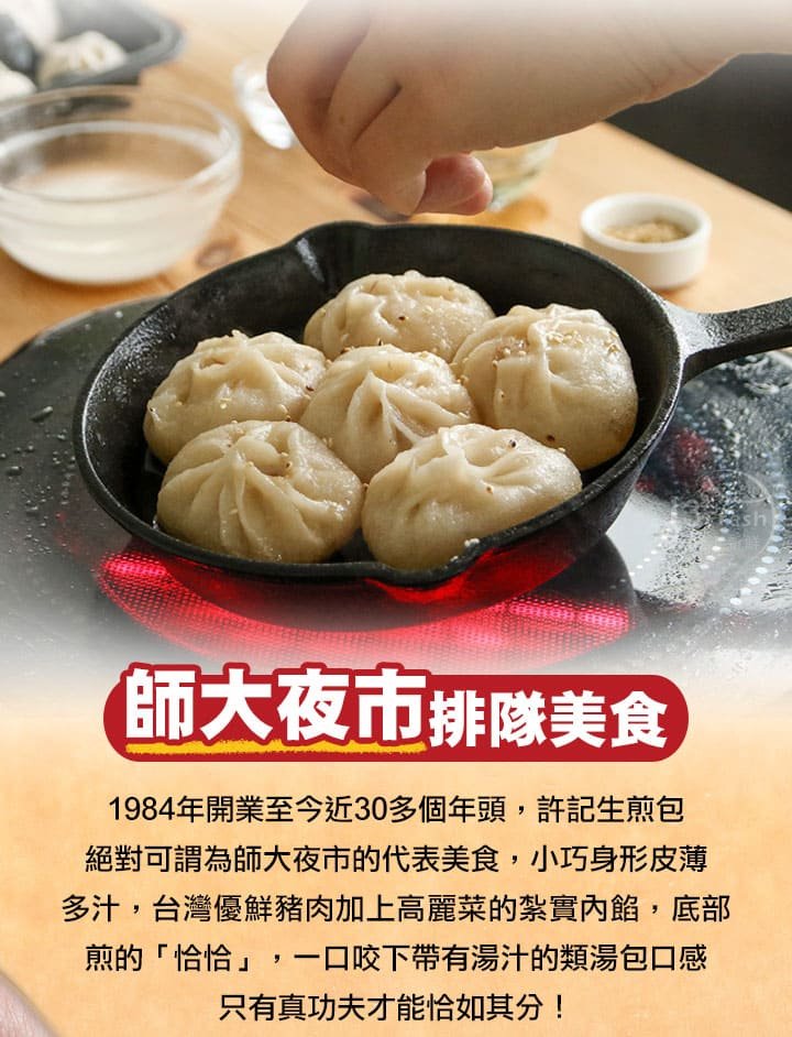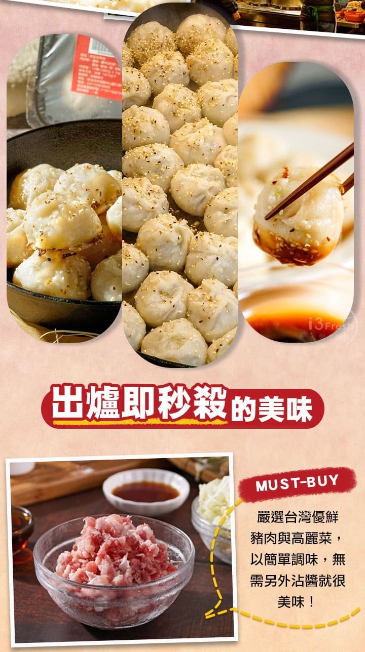 成分:麵粉、高麗菜、豬肉(台灣)、水、麻油、醬油、糖、薑、胡椒 過敏原:本產品含有麩質之穀物、大豆、芝麻及其製品、不適其過敏體質者食用 食用方式: DIY平底鍋烹煮方式(無須解凍) 1、 準備適中平底鍋與麵粉水(麵粉水:用盒底殘留少許麵粉、加50cc水左右攪拌即可) 2、 使用中火倒入少許的油 3、 將生煎包(無須解凍)排入鍋中(包子間隔不能太近) 4、 倒入麵粉水約5mm高度,蓋上鍋蓋悶煮8-10分鐘 5、 當水份即將煮乾時鍋底呈現金黃色,此時開小火煮1分鐘直到鍋底呈現焦糖色即可食用 *烹飪完成後請記得灑上香噴噴芝麻 DIY氣炸鍋料理做法: 1、 氣炸鍋外鍋加入約50-100ml的水(視鍋子大小) 2、 將內鍋表面上先抹上少許的油,生煎包(無需解凍)放入內鍋中(包子間隔不能太近)。 3、 在將生煎包的表面上噴上或抹上少許的油 4、 調180度C/12-15分鐘 (時間自行調整,想吃酥脆油多抹一些、時間延長1-2分鐘) 5、 完成後生煎包表皮金黃,有湯汁會爆出來,內餡有美味湯汁。 *烹飪完成後請記得灑上香噴噴芝麻 ●本產品因為無添加防腐劑,開封後請一次食用完畢,不可重複放冷凍庫。 注意事項:本公司產品生產、儲存、運送均採低溫處理,商品請勿反覆解凍食用。
