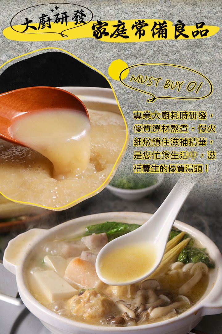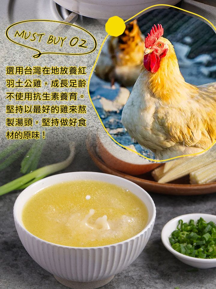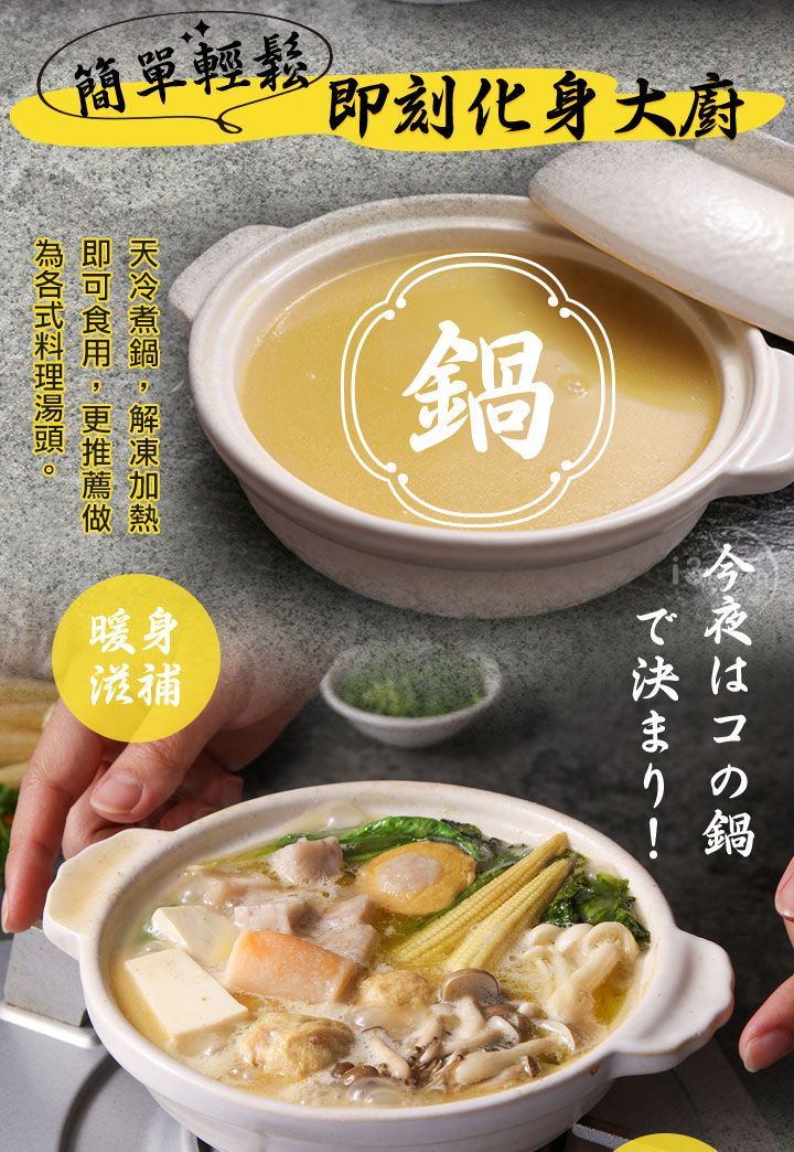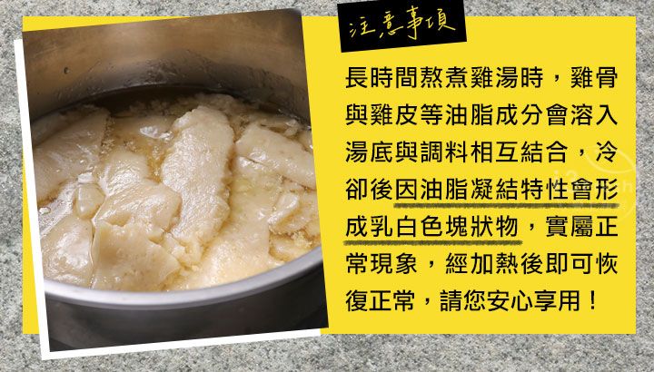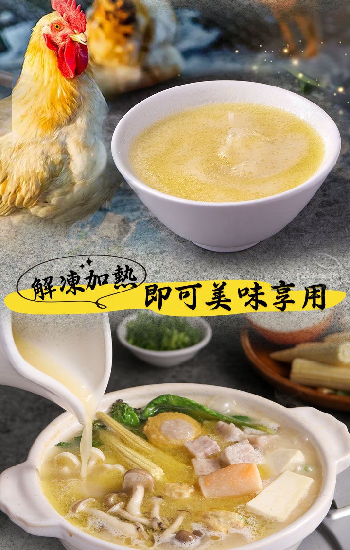 湯頭用土雞雞架慢火熬煮6小時,膠質與脂肪完美乳化呈現黃金白濁色,雞骨分解後滲出大量膠原蛋白,解凍加熱即可食用!