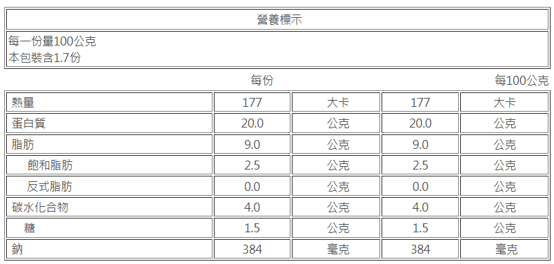 產品成份:雞肉、鹽、糖、米霖(糯米、米麴、果糖、水、釀造酢、鹽)、米酒、葡萄糖、白胡椒粉、調味劑(味精)、品質改良劑(多磷酸鈉、焦磷酸鈉、偏磷酸鉀)、抗氧化劑(異抗壞血酸鈉)、新紅素A(氯化鈉、亞硝酸鈉、磷酸鈣)。