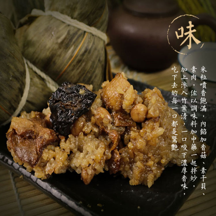 粽葉先煮殺菌~洗好待用,香菇、素干貝、素肉泡水瀝乾下鍋炒香,糯米、花生洗好調味料煮好伴在一起,粽子包好用壓力鍋煮熟,佐以調味料加約20幾種高級中藥一起拌炒包在粽子裡和米香、其他配料的香味搭配,加上滲入竹葉清香, 一口咬下濃厚的花生米豆香味,吃下去的每一口都是驚艷, 口味更多元化,營養更豐富,更健康。