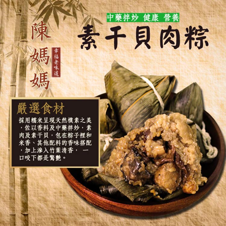 1.商品組合/規格:30顆2.商品品名:陳媽媽-養生中藥素干貝肉粽(30顆)3.商品重(容)量:135g/顆4.內容物成分(如含有豬、牛成分請加註國別):香菇,素肉,素干貝,花生,糯米,高級中藥(肉桂,花椒,丁香,茴香仔,荳寇,甘草,黃薑,陳皮等等20幾種中藥),調味料5.食品添加物名稱:香菇,素肉,素干貝,花生,糯米,高級中藥(肉桂,花椒,丁香,茴香仔,荳寇,甘草,黃薑,陳皮等等20幾種中藥),調味料6.原產地(國):台灣7.製造廠商或國內負責廠商名稱:永全鑫國際科技有限公司8.製造廠商或國內負責廠商地址:高雄市仁武區澄觀路1633號9.製造廠商或國內負責廠商電話:(07)373-000710.以消費者收受日算起,至少距有效日期前?日以上:4511.食品業者登錄字號:E-127218298-00000-112.投保產品責任險字號:080403PDT00143備註欄:◆◆◆如須指定到貨日請在備註欄備註需到貨日期,如未指定到貨日將於5天內到貨◆◆◆