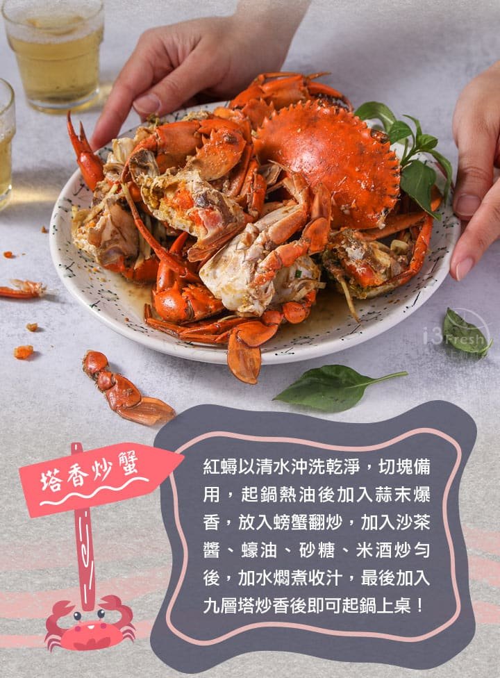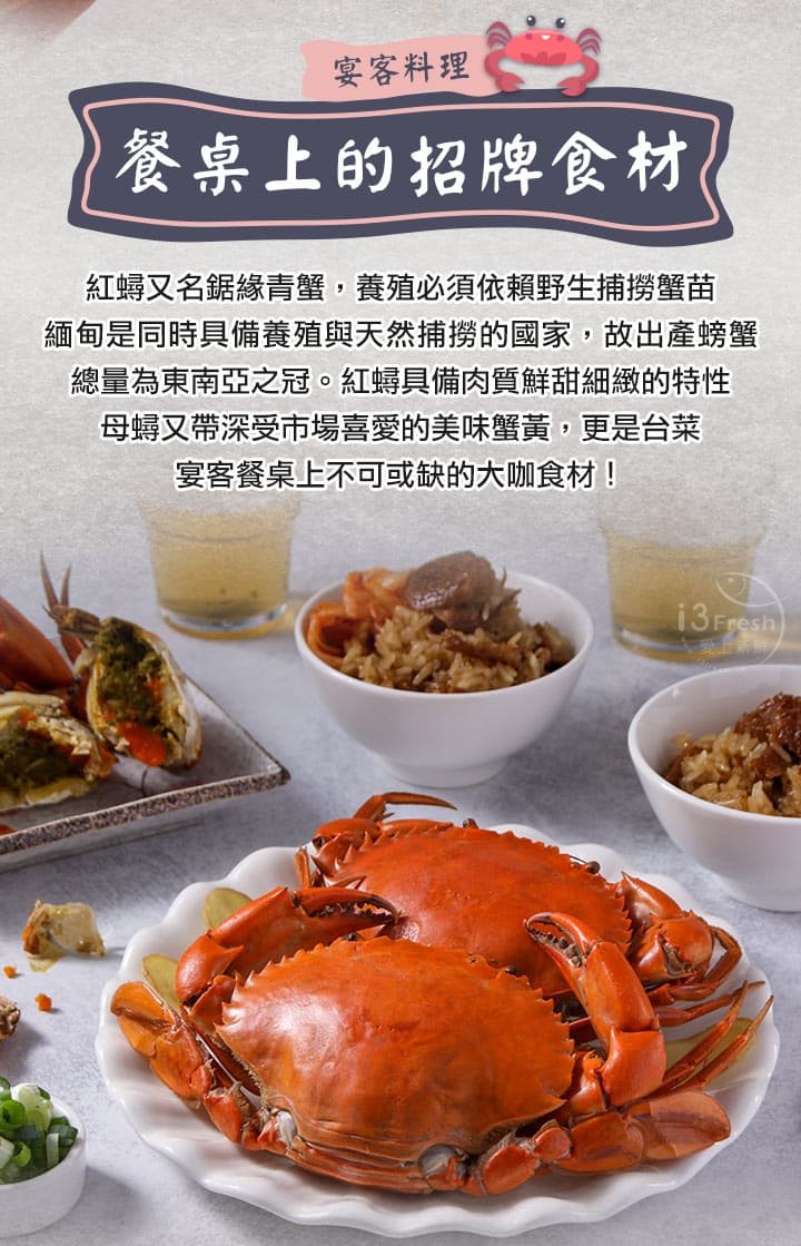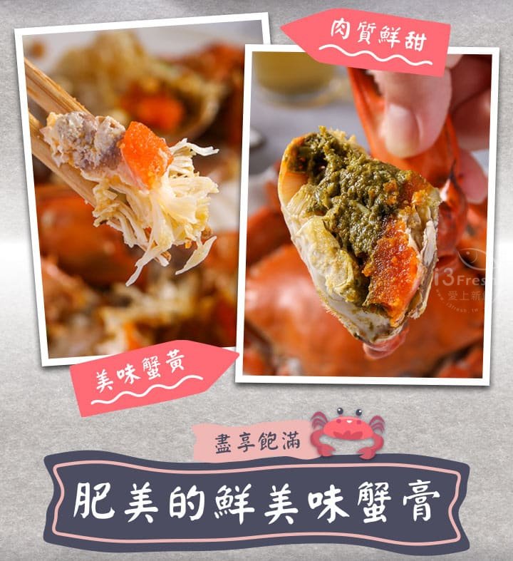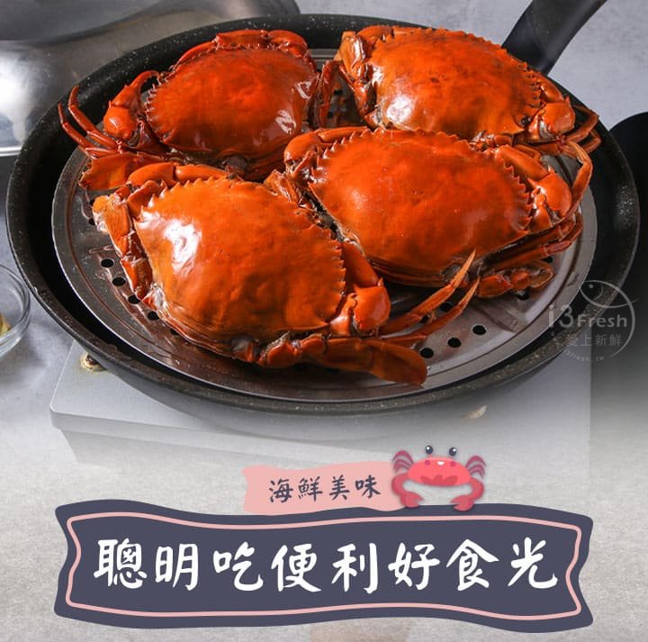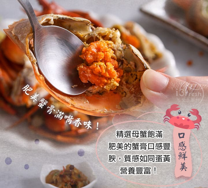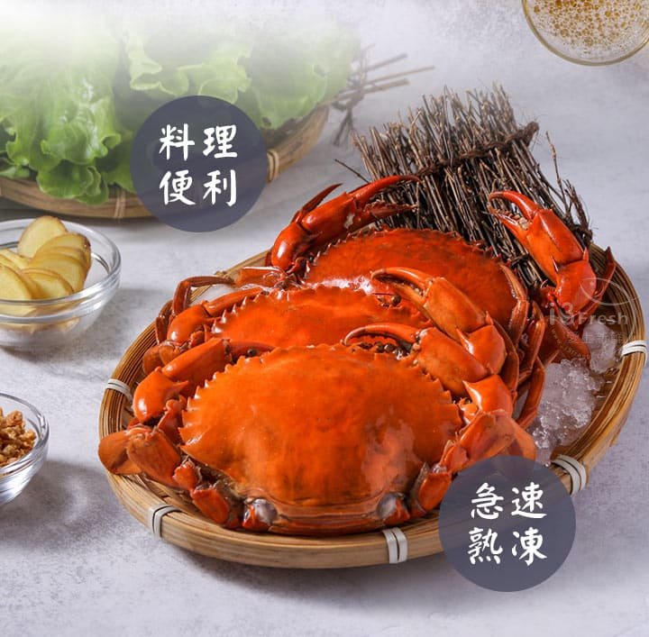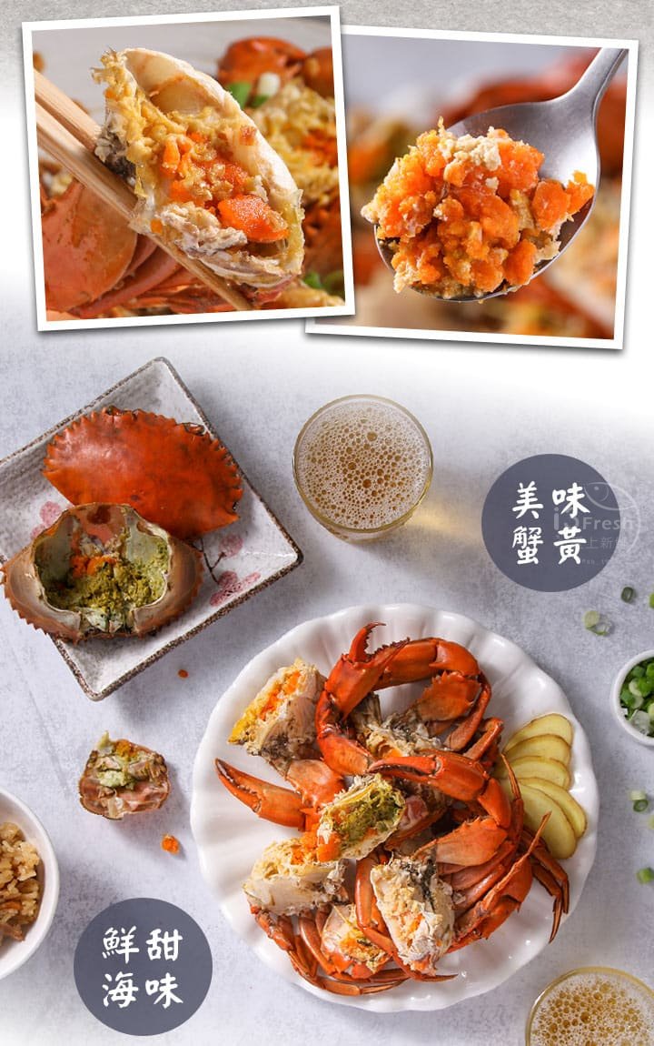食慾之秋亦是螃蟹正肥美的季節,選用各個蟹黃飽滿的紅蟳,清蒸後急速冷凍保留鮮甜緊緻的肉質。紅蟳的蟹卵呈現飽和橘黃色,口感Q彈、味道濃郁,正是季節限定的美味!