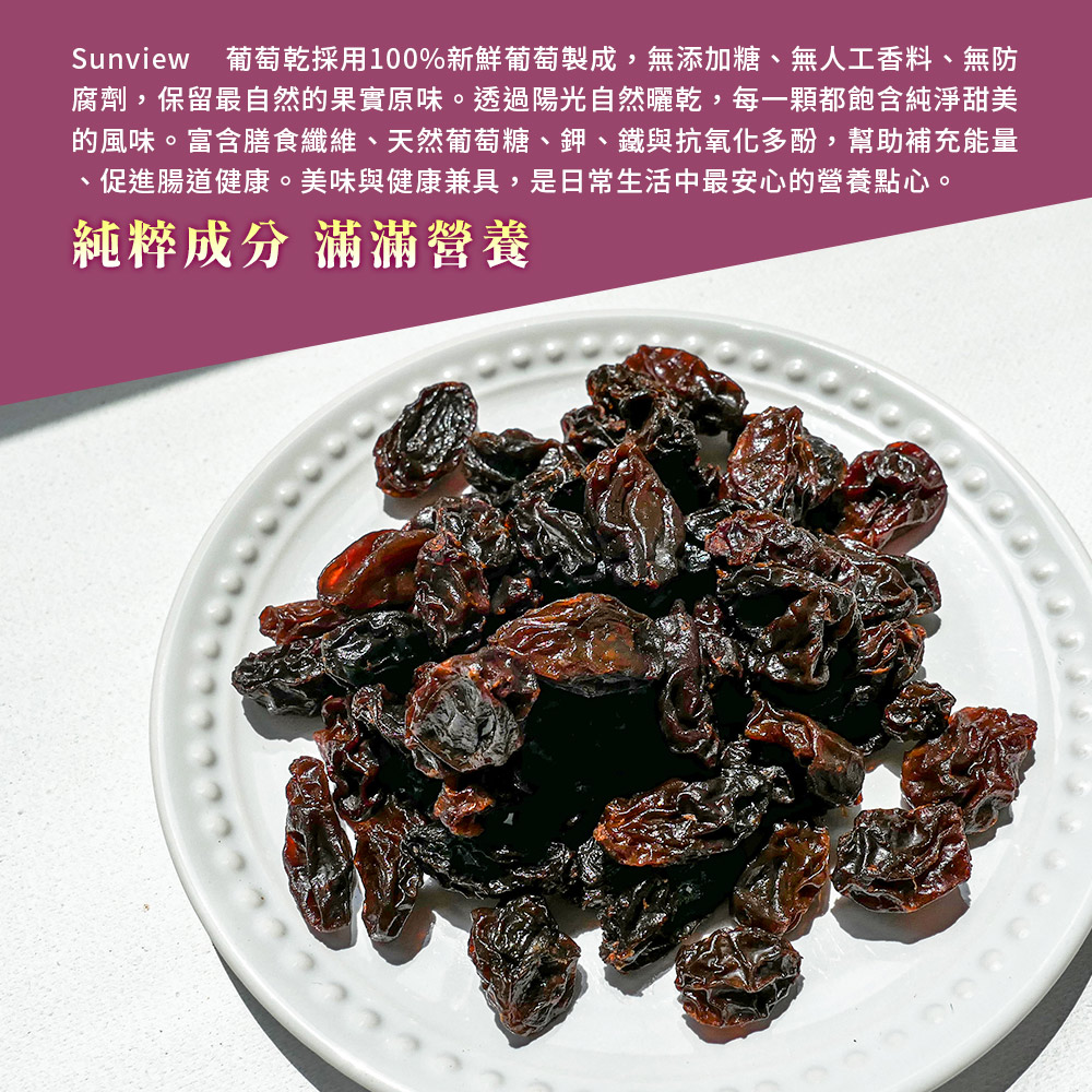 ☀️ 保存方式|常溫保存,開封後儘快食用完畢☀️ 有效期限|一年☀️ 關於葡萄乾顏色|Sunview的葡萄乾在製作過程中,沒有添加二氧化硫以防止變色 因此綠葡萄與紅葡萄在脫水製成葡萄乾的過程,會因為自然現象呈現偏棕色與黑色的自然顏色,請安心食用。
