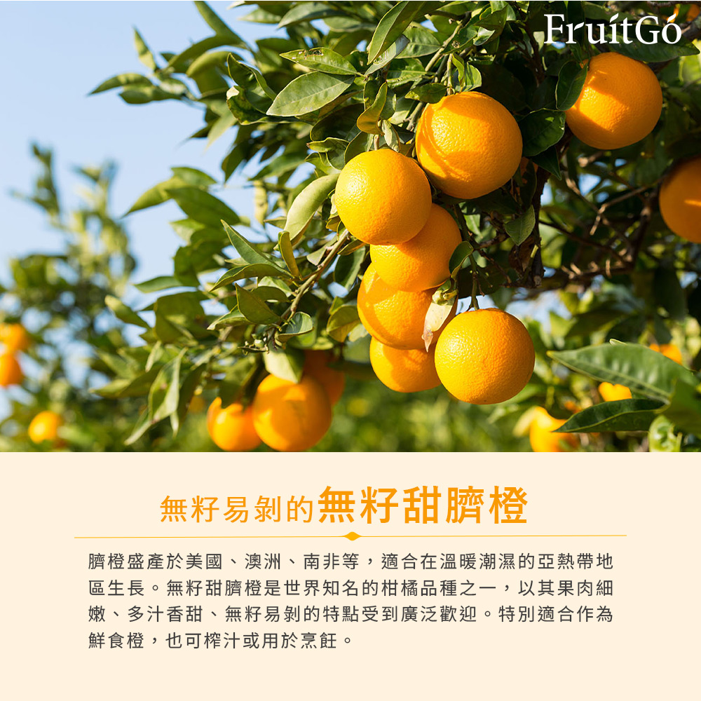 臍橙果汁充沛,橙香撲鼻臍橙(Navel)又名肚臍丁,是甜橙中的一種,因果實底部突出呈圓錐狀似「肚臍」而得名。臍橙果皮金黃,一刀切下,果汁充沛,橙香濃郁撲鼻!甜度高酸度低,果肉纖維細緻且籽少!風味與台灣的柳丁截然不同。臍橙通常會比一般甜橙大一些,擁有大量維生素C、胡蘿蔔素與其他營養素,也有「甜橙中的貴族」的美稱。盛夏的消暑神器臍橙盛產於美國、澳洲、南非等,適合在溫暖潮濕的亞熱帶地區生長。果汁充沛,甜度高的臍橙,讓你盛夏時一顆接個一顆,營養又消暑!☀️保存|冷藏約2-3週,提早食用風味較佳。