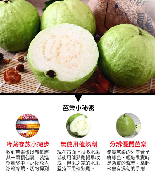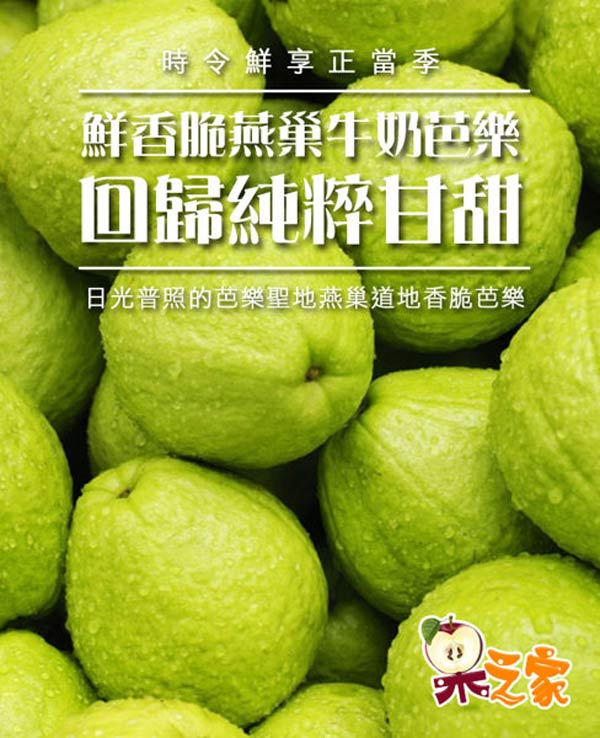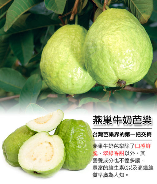 《燕巢芭樂的特色》燕巢因為經泥火山岩漿土壤沖積形成,土壤經過土質測定分析,發現所含的鈣、磷、鎂偏高,並且許多微量元素也比一般土壤高,所以造就出燕巢芭樂所擁有的特殊口感和脆度。口感鮮脆、清香淡雅、香甜誘人,如大地翡翠般的燕巢牛奶珍珠芭樂,除了先天土地所擁有的優勢外,還使用牛奶作為灌溉肥料,使芭樂成熟後更增添一股誘人風味,不容您錯過。 《精心選果品質穩定》果之家的水果皆為自然熟成,無使用任何催熟劑。在果實完美熟成的時候收成,立刻以熟練的果農進行人工選果,將品質較差的芭樂淘汰,之後再以機器進行分重,確保送到您手上的芭樂皆能讓您吃的開心。