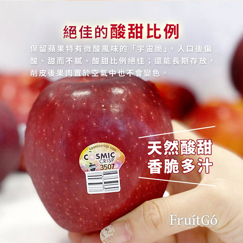 天然酸甜 香脆多汁「宇宙脆」(Cosmic Crisp),因果皮上有類星星的小點而得名,也因它的脆度得名,它的名字很直接的表明了它的特性。保留蘋果特有微酸風味的「宇宙脆」,入口後偏酸、甜而不膩、酸甜比例絕佳;還能長期存放,削皮後果肉置於空氣中也不會變色。一推出即掀起全美搶購風潮!