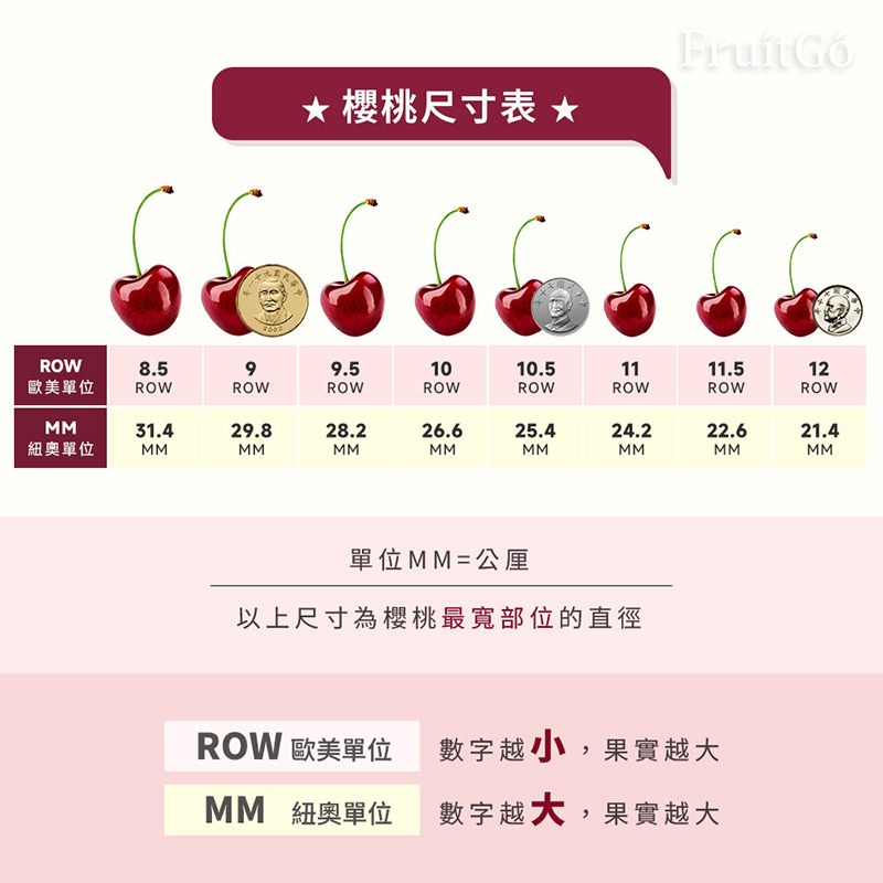 品質、品質、品質!買櫻桃最怕買到不好吃的!市面上有櫻桃品種多到數不清,每個品種的櫻桃味都有些不同。重點來了!!!"對的時間點吃對的品種"馥果每天到桃園機場品檢新鮮到的櫻桃,專業幫您挑選每天最好吃、品質最好的那一批!色澤艷麗,果實光滑碩大,皮薄肉厚!櫻桃香甜多汁的果肉,又帶點微微的酸味,恰到好處的完美搭配,讓櫻桃成為水果禮盒的最佳選擇。酸酸甜甜多汁的櫻桃,讓人一口接一口,回味無窮。現正是南半球的夏季,春夏有著充足的日照,可說是櫻桃的最佳產地。紐西蘭擁有得天獨厚的氣候,島上有著豐富的火山地形,而肥沃的火山土壤以及溫和宜人的氣候,都能讓櫻桃有著良好的生長環境。☀️保存|❶ 收到後一定要冷藏,櫻桃果肉降溫至少需冷藏5小時,才能恢復櫻桃果肉脆度。❷ 櫻桃保存須保持乾燥,食用前再清洗櫻桃,才不會濕氣太高讓櫻桃腐壞喔!❸ 櫻桃嬌嫩,請避免壓傷。新鮮櫻桃建議收到後3~5天內享用完畢。