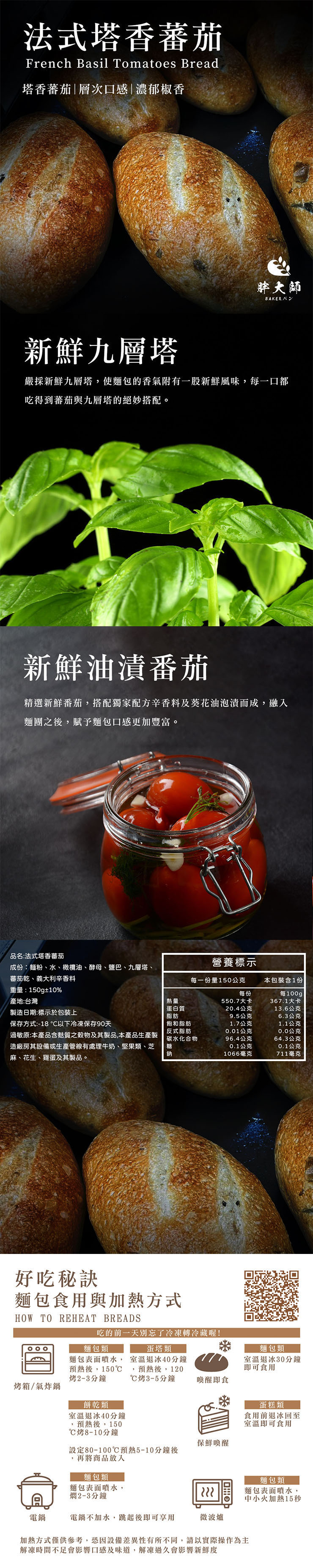 成份:麵粉、水、橄欖油、酵母、鹽巴、九層塔、蕃茄乾、義大利辛香料 過敏原:本產品含麩質之穀物及其製品,本產品生產製造廠房其設備或生產管線有處理牛奶、堅果類、芝麻、花生、雞蛋及其製品。