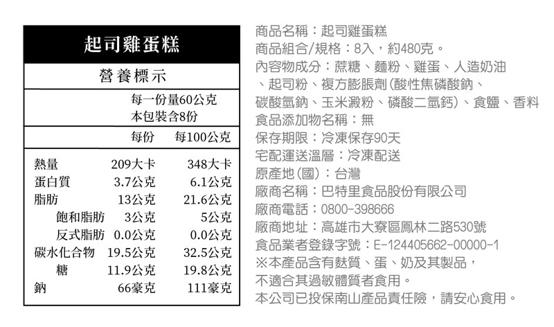 雞蛋、蔗糖、麵粉、人造奶油、起士粉、泡打粉、食鹽