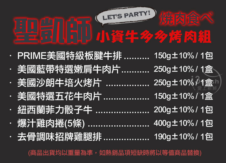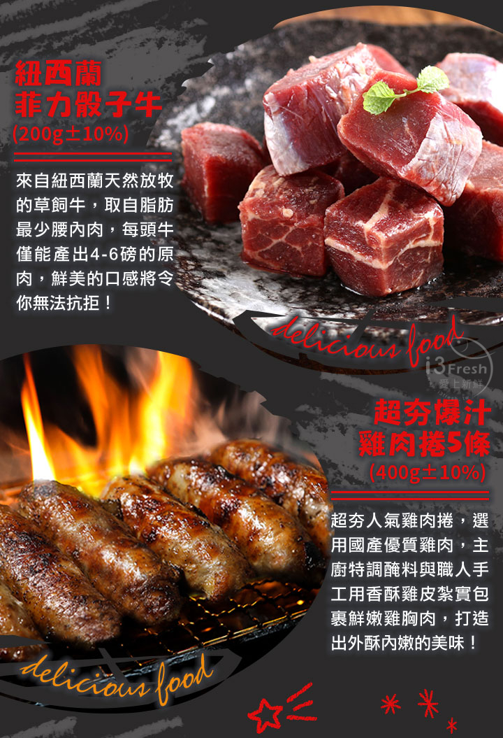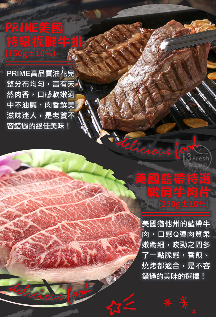 【PRIME美國特級板腱牛排】 商品重量:150g±10% 商品成分:牛肉(美國) 過敏原:無 商品產地:美國 保存期限:一年 保存方式:冷凍≦-18度 食用方式:需煮熟食用 【美國藍帶特選嫩肩牛肉片】 商品重量:250g±10%/盒 包裝方式:盒 商品產地:美國 商品狀態:-18度c冷凍 儲存條件:冷凍儲存 保存期限:18個月 食用方式:解凍拆封後,即可下鍋烹煮。 【美國特選五花牛肉片】 商品重量:150g±10% 商品成分:牛肉(美國) 商品產地:美國 保存期限:12個月 保存方式:冷凍≦-18度 食用方式:需煮熟食用 【紐西蘭菲力骰子牛】 商品重量:200g±10%/包 商品產地:紐西蘭 商品期限:18個月(-18度c冷凍) 食用方式:解凍拆封後,即可下鍋烹煮。 【美國沙朗牛培火烤片】 商品重量:250±5% /盒 商品產地:美國 商品狀態:-18度c冷凍 保存期限:18個月 食用方式:解凍拆封後,即可下鍋烹煮。 【爆汁雞肉捲】 商品重量:400g/包 (5條/包,80g/條) 商品成分:雞肉、雞皮、水、鹽、糖、樹薯澱粉、麥芽糊精、大豆蛋白(非基因改造)、品質改良劑(多磷酸鈉、偏磷酸鉀)、調味劑(L-麩酸鈉)、蒜粉(大蒜粉、麥芽糊精、辣椒粉、大蒜萃取物)、白胡椒粉、百草粉(肉桂、丁香、 山奈、小茴香、五加皮)、調味劑(胺基乙酸、DL-胺基丙酸、 5'-鳥嘌呤核苷磷酸二鈉、5'-次黃嘌呤核苷磷酸二鈉)、抗氧化劑(異抗壞血酸鈉)、血漿蛋白【豬血漿(美國)、食鹽、蛋白粉(雞蛋)、氫氧化鈣】 過敏原:1.本產品含有大豆、蛋及其製品 2.本產品與其他含有牛奶及蛋的於同一工廠生產,不適合對其過敏體質者食用 商品產地:台灣 保存期限:12 個月 食用方式:不須解凍,可直接油炸,油炸溫度約180℃連續油炸5-8分鐘即可 【去骨調味招牌雞腿排】 成分:雞肉、水、原味雞排料(大豆分離蛋白、多磷酸鈉、焦磷酸鈉(無水)、麥芽糊精、乾酪素鈉、L-麩酸鈉、DL-胺基丙酸、5’-次黃嘌呤核苷磷酸二鈉、5’-鳥嘌呤核苷磷酸二鈉、琥珀酸二鈉、白胡椒、香料、肉味香料(麥芽糊精、辛烯基丁二酸鈉澱粉、香料(含中鏈三酸甘油酯)、脂肪酸甘油酯、維生素E<抗氧化劑>)、小荳蔻、醋磺內酯鉀<甜味劑>) 過敏原:本產品含有大豆及牛奶製品不適合對其過敏體質者食用。 商品重量:190g±10% 雞肉產地:美國或加拿大 原產國(加工地):台灣 保存期限:一年 【共同資訊】 注意事項:本公司產品生產、儲存、運送均採低溫處理,商品請勿反覆解凍食用。