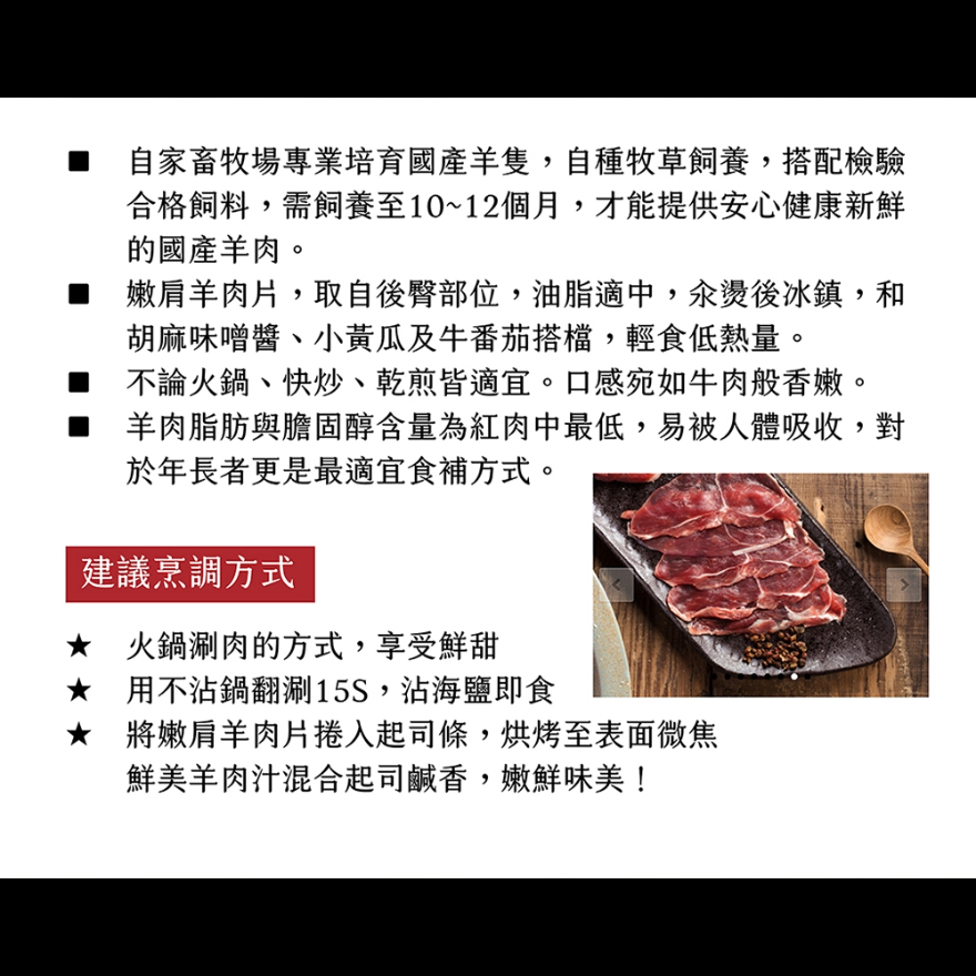 特選自口感軟嫩的板腱部位,雪花般美麗的細緻油花,中間帶著一條Q彈的筋,有著不同的層次和口感。切成0.2cm的厚度,不論是煮火鍋或炒菜,都是您最佳的選擇!