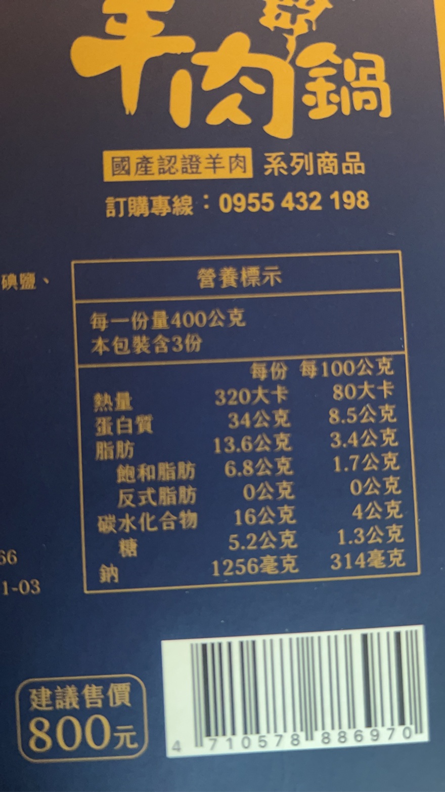 營養標示 每一份量:400公克 本包裝含3份 項目 每份 每100公克 熱量 320大卡 80大卡 蛋白質 34公克 8.5公克 脂肪 13.6公克 3.4公克 飽和脂肪 6.8公克 1.7公克 反式脂肪 0公克 0公克 碳水化合物 16公克 4公克 糖 5.2公克 1.3公克 鈉 1256毫克 314毫克