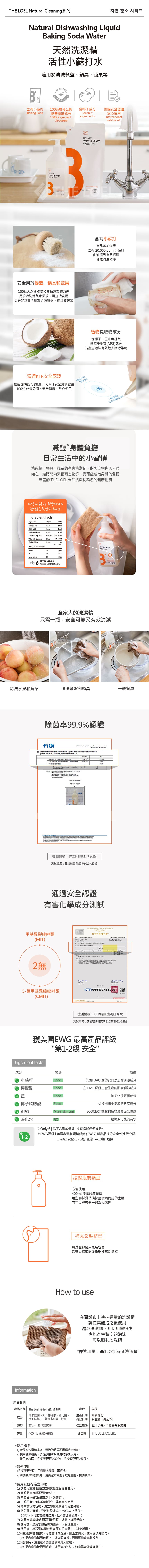 -Natural Cleaning系列-適用於餐具碗盤、水果蔬菜清洗等-含活性小蘇打和椰子提取物成分,優異去除油漬-採用抗菌&不傷手天然成分-此為濃縮液,微量已足夠使用,極高CP值-除菌率達99.9%認證(韓國FITI)-100%天然提取物和食品添加物製造,安全無害-100%成分公開,絕無隱藏成分-獲得國際安全認證-獲美國EWG 最高產品安全評級-不含任何防腐劑成分- 無添加香料、無着色-不含MIT和CMIT有害成分-韓國製造