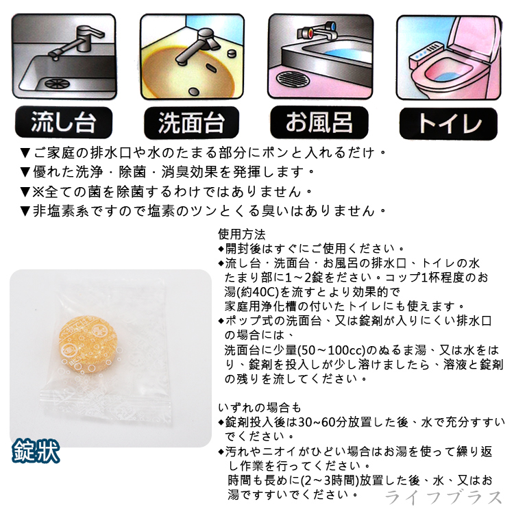 日本製造品質安心,水管洗淨、消臭,保持水管暢通。使用方法::流理台、洗臉台、浴室等排水口取出1錠放入,最好加入40℃的水1杯效果最好,放入後置約30-60分鐘再沖入充份的水。