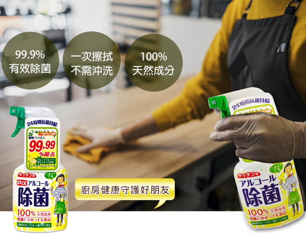 想要守護家人的健康,保持廚房環境潔淨是不可或缺的一步。日本獅子化學 PIX 廚房酒精除菌消臭噴霧 400mL,以天然萃取成分為基底,快速除菌消臭,連食器都能安心使用。