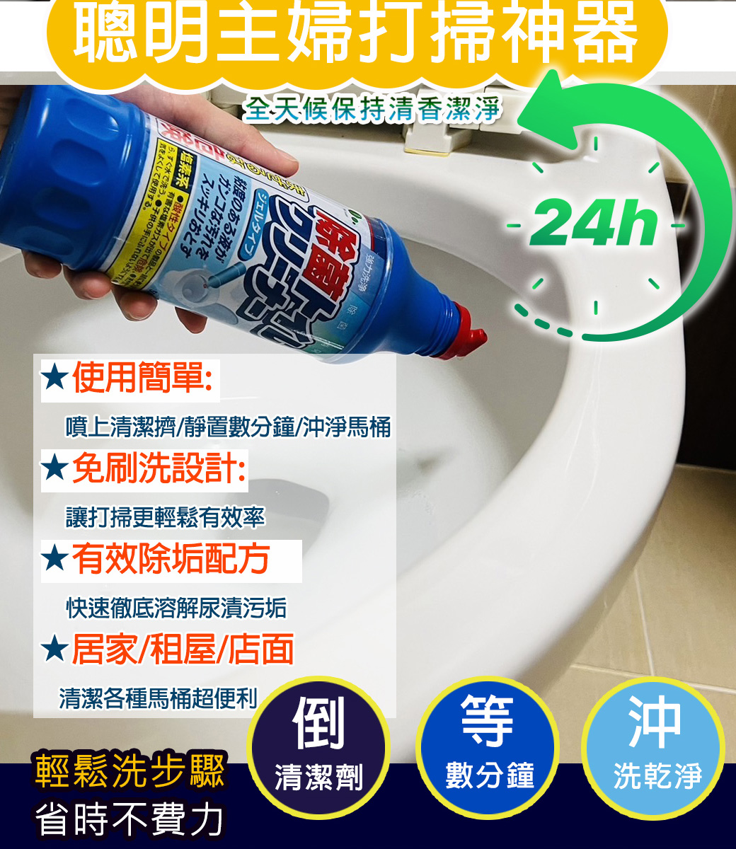 貼心的噴嘴設計可以準備的瞄準髒污,也能輕鬆的噴灑於馬桶邊緣不易清潔的死角,不用刷刷洗洗,輕鬆倒入後靜置數分鐘直接沖水即可,用過定說讚的清潔好物