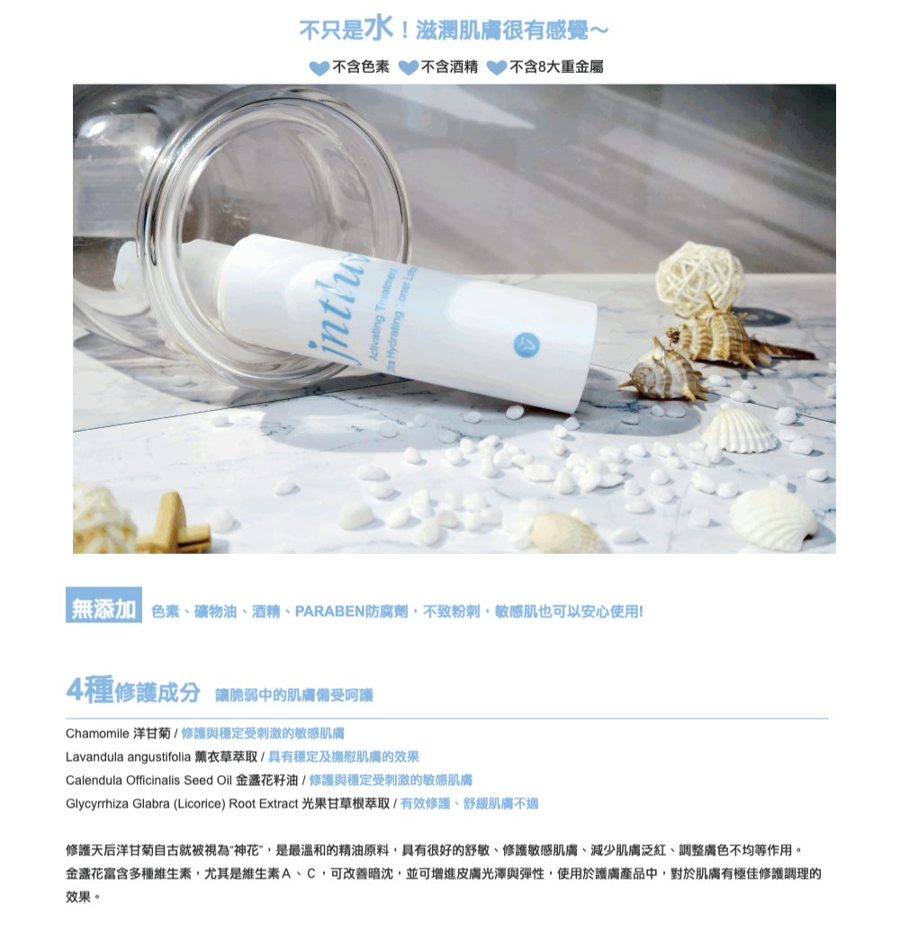 無添加 色素、礦物油、酒精、PARABEN防腐劑,不致粉刺,敏感肌也可以安心使用!