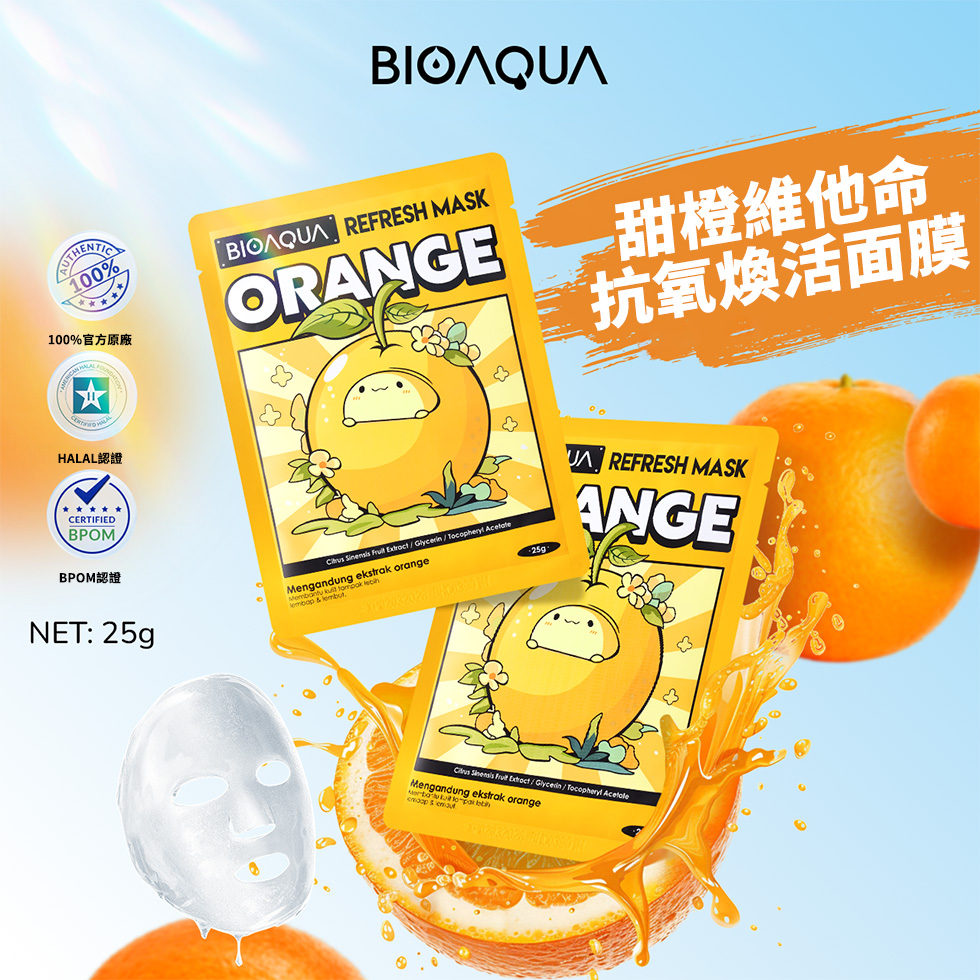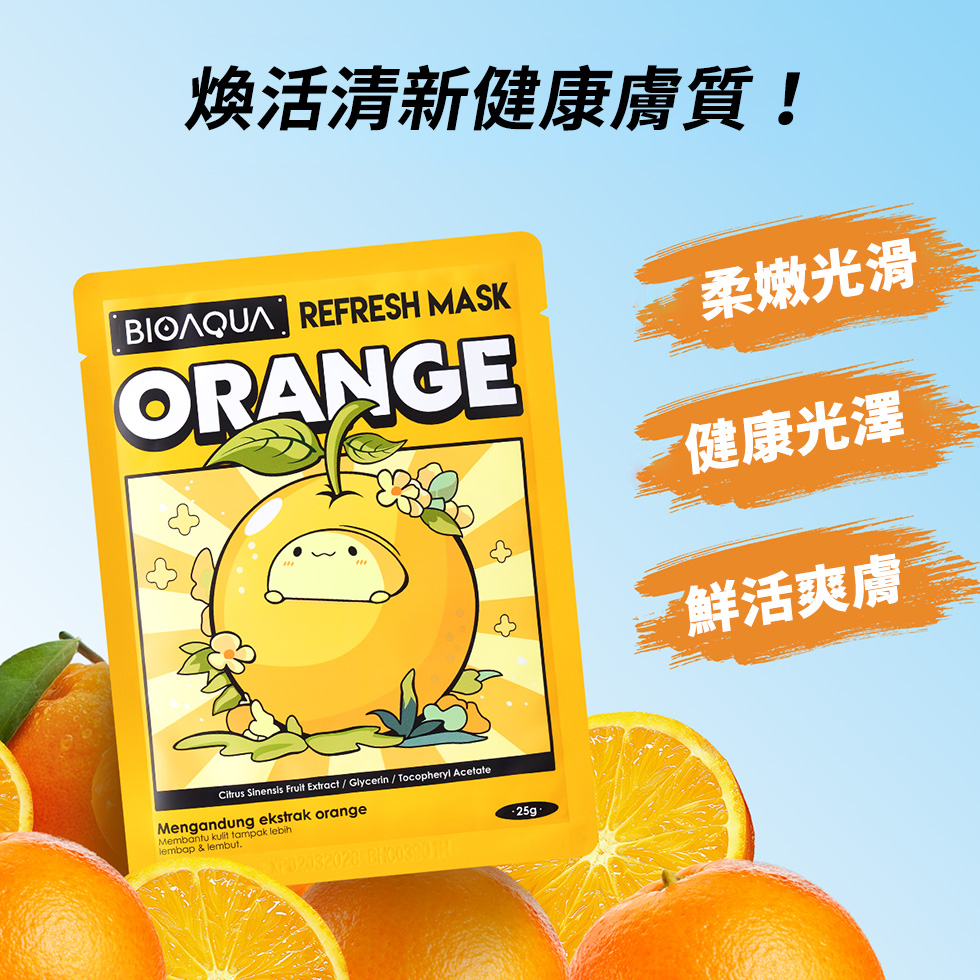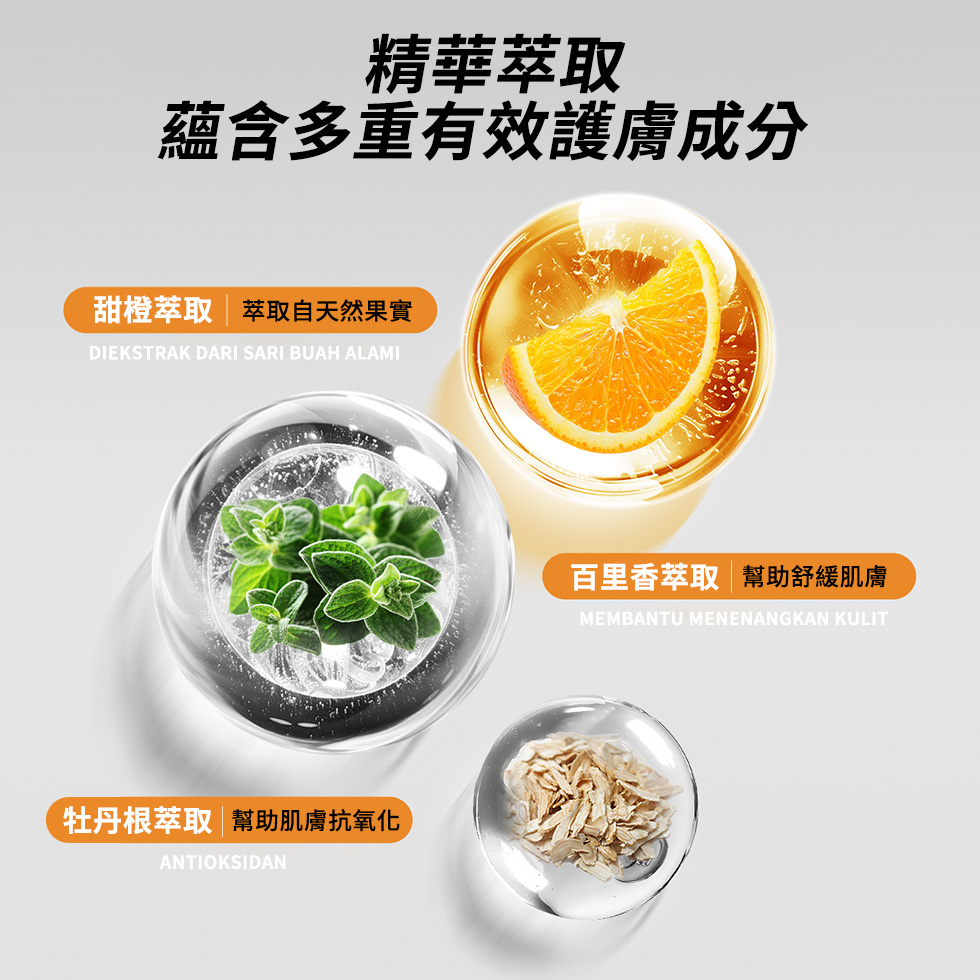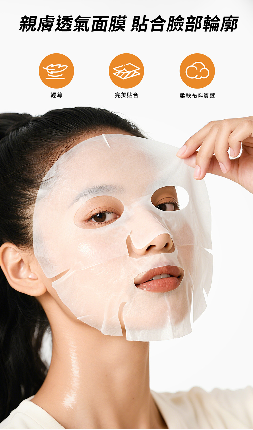 含甜橙、牡丹根、百里香萃取,幫助肌膚調理油水平衡,強化並穩定膚況,適合疲倦肌膚。親膚透氣面膜布,360°貼合臉部肌膚,幫助精華滲透肌底。