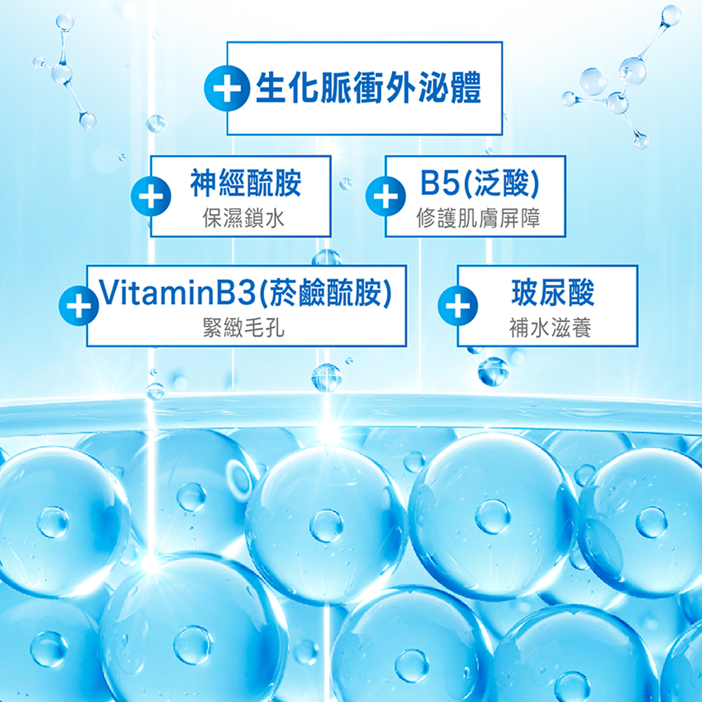 含有神經醯胺、VitaminB3(菸鹼醯胺)、B5(泛酸) 、B6、玻尿酸等多重抗老成分