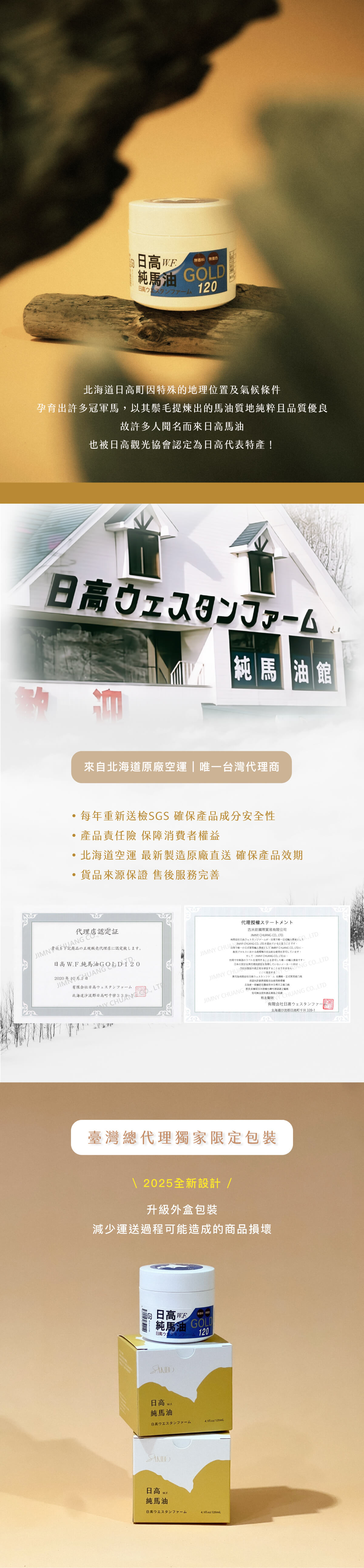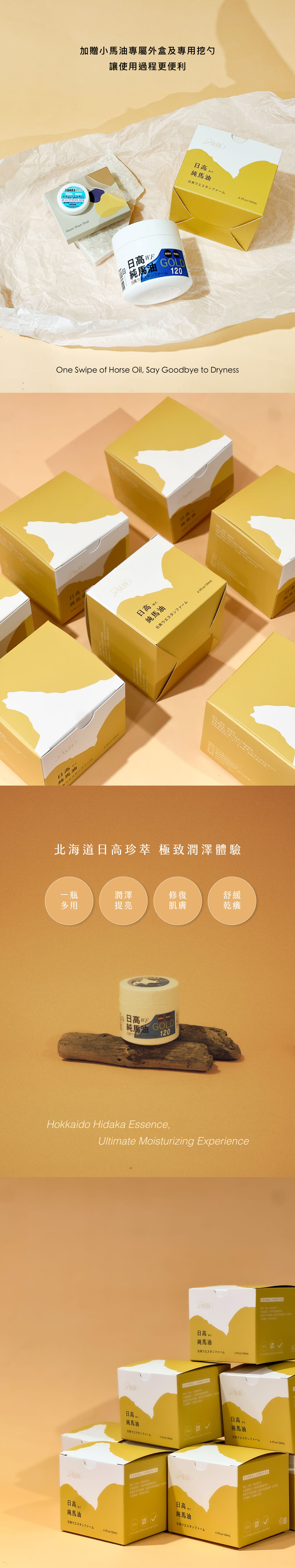 最新效期|2027/05△單筆下單超過20件商品,將超過超商交寄重量體積限制 請選擇宅配配送下單△週一至週六當日下午五點前下單,當日出貨 週日與國定假日不出貨△自2022.12月起日本原廠不再提供束口袋!北海道日高W.F.純馬油 三入Horse Oil單瓶內容量 120ml✧優質油脂,與人體脂肪酸相近,好吸收✧質地溫和、延展性佳、吸收快✧對抗乾癢乾燥肌 全身適用✧生活萬用,一瓶搞定◼︎主要成分◼︎純馬油◼︎貨源|公司貨◼︎產地|日本MADE IN JAPAN日本原裝進口本產品已投保富邦產物產品責任險一仟萬元25AML0000046號< 保存方式 >常溫陰涼處,炎熱時建議可放冰箱保存購買回來第一次使用前請先將瓶蓋打開置放,可減少動物性油質的氣味100%馬油為動物性油脂低溫保存會呈現半固態狀態使用時會因人體的體溫而融化並可節省其用量炎熱天氣中呈現液態狀屬正常現象,品質不受影響可安心使用< 注意事項 >購買前請先評估是否適合自己的肌膚使用後若有過敏或不適請即刻停止使用並請教醫生