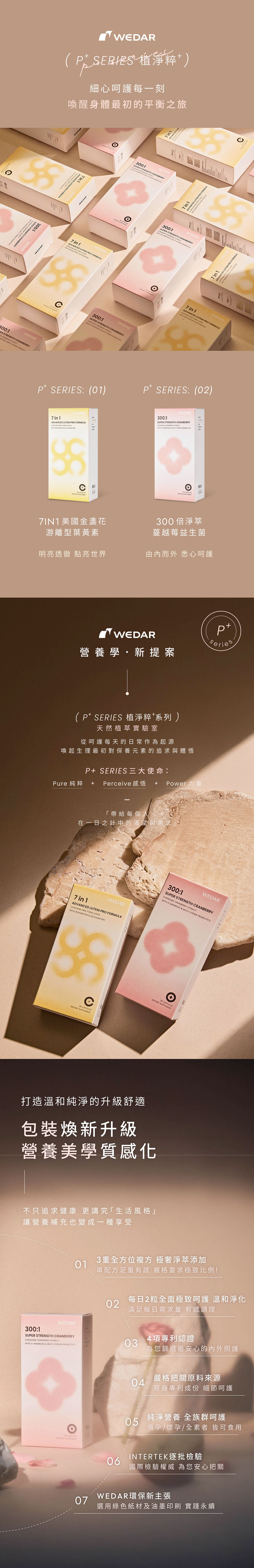 WEDAR®推出P+ SERIES全新系列,從呵護每天的日常作為起源,三大使命:Pure純粹/Perceive感悟/Power力量,帶給每個人在一日之計中的渴望與需求。選用加拿大CranCAN®頂級蔓越莓萃取、美國專利D-甘露糖、女性專屬私密益生菌,透過滋養、防護、加乘三面向達成每日補給。