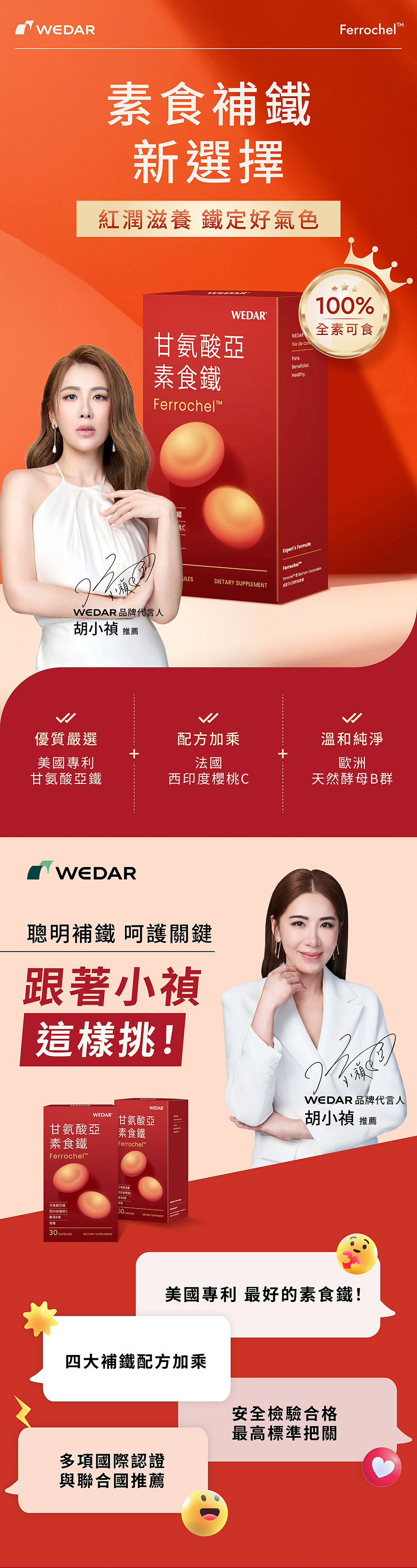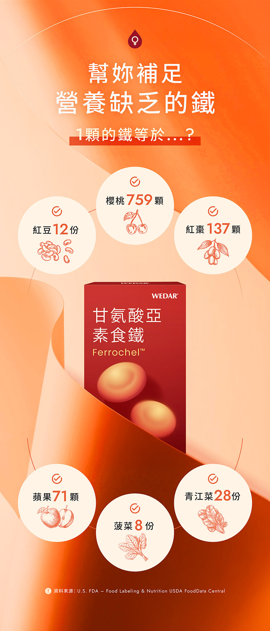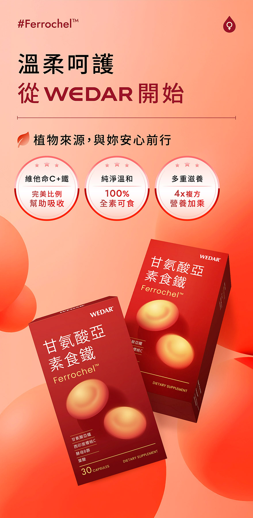 今天補鐵了嗎?WEDAR 甘氨酸亞素食鐵專為女性打造,特選美國專利甘氨酸亞鐵,卓越的吸收率,獲得多國認證,並添加西印度櫻桃維他命C、天然酵母B群、葉酸等多重複方,素食友善、孕媽咪也可以安心補給,補給營養一顆就鐵定夠。