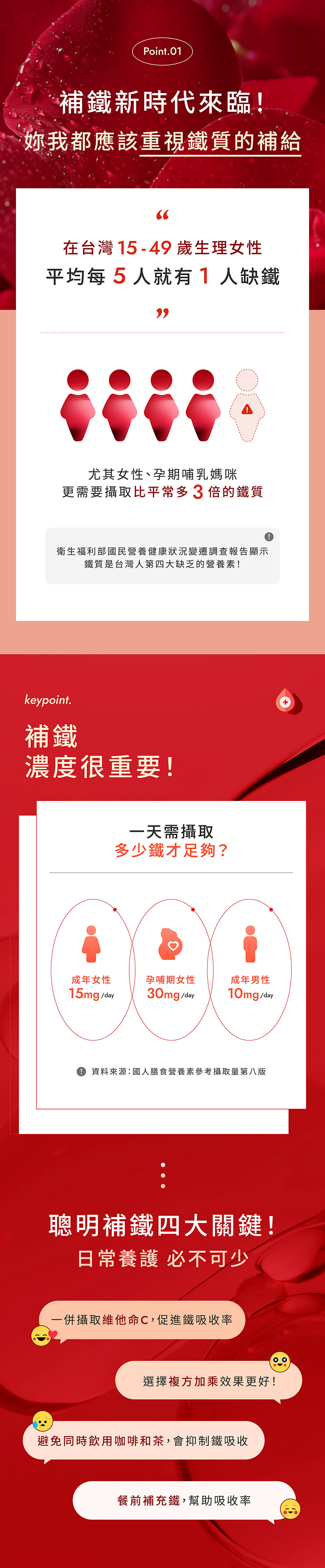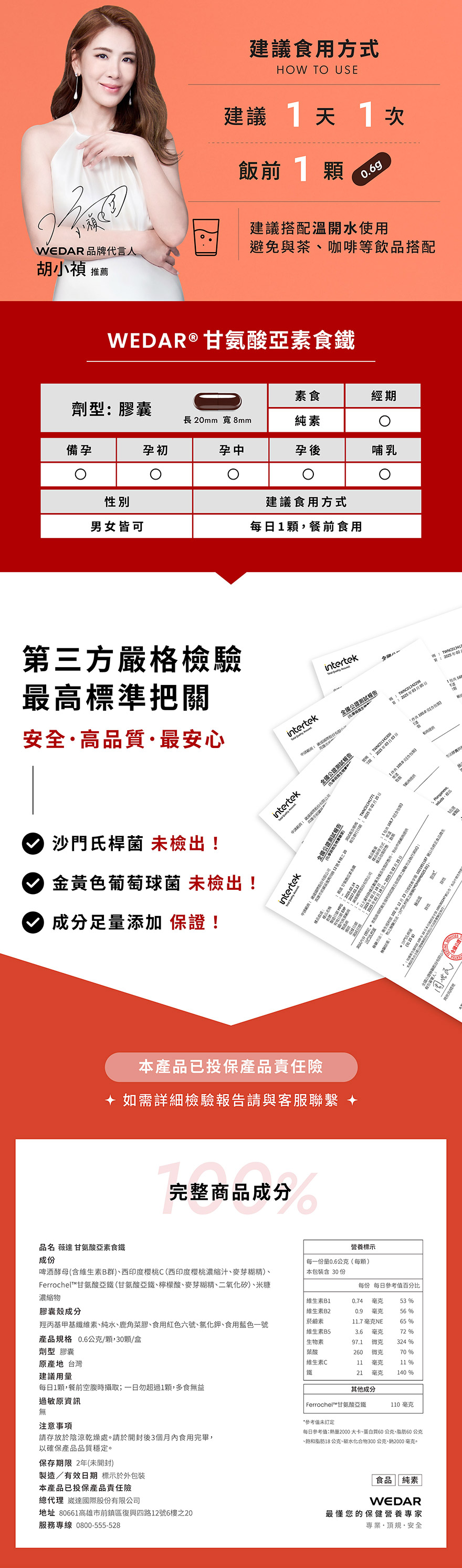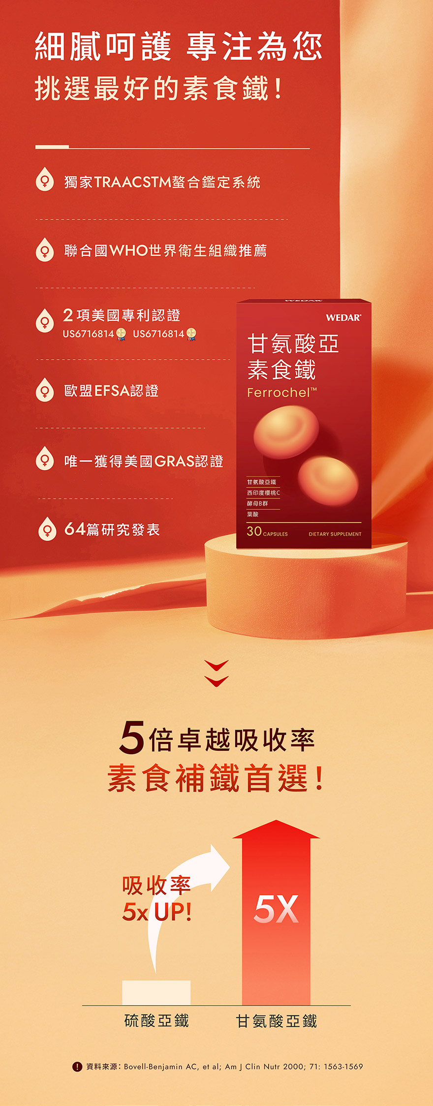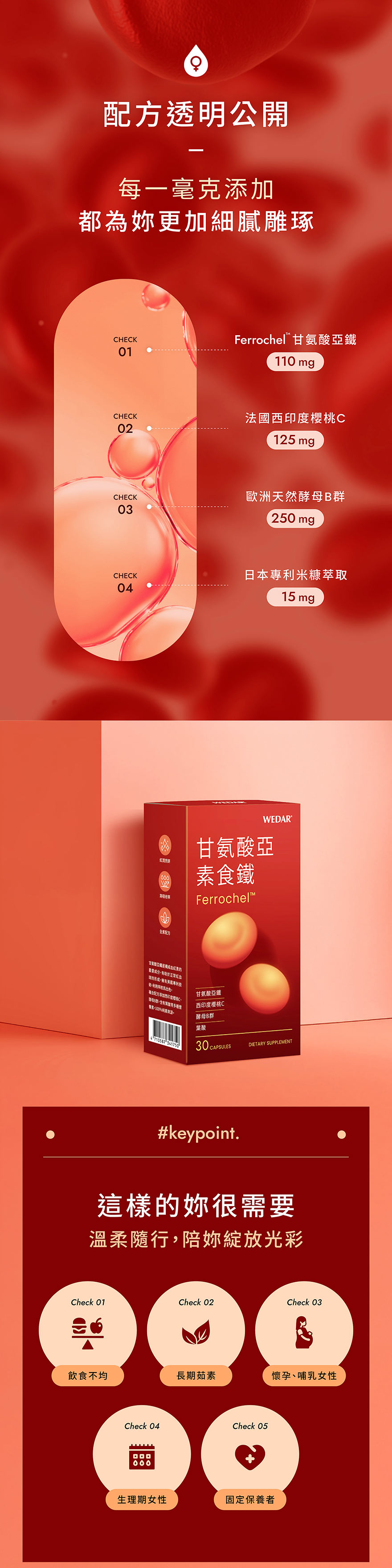 今天補鐵了嗎?WEDAR 甘氨酸亞素食鐵專為女性打造,特選美國專利甘氨酸亞鐵,卓越的吸收率,獲得多國認證,並添加西印度櫻桃維他命C、天然酵母B群、葉酸等多重複方,素食友善、孕媽咪也可以安心補給,補給營養一顆就鐵定夠。