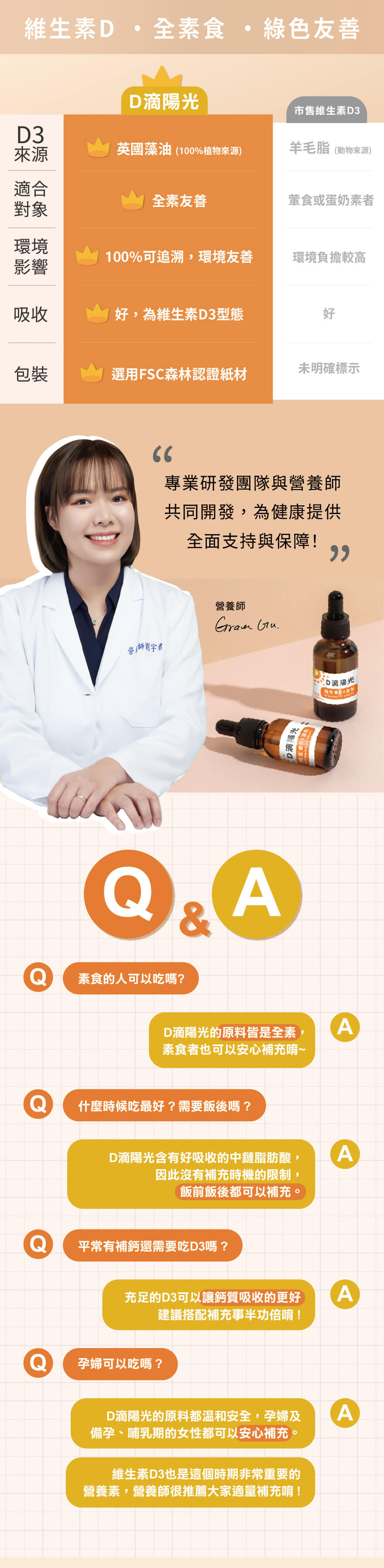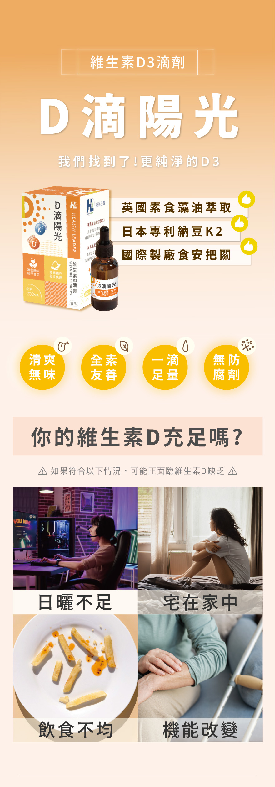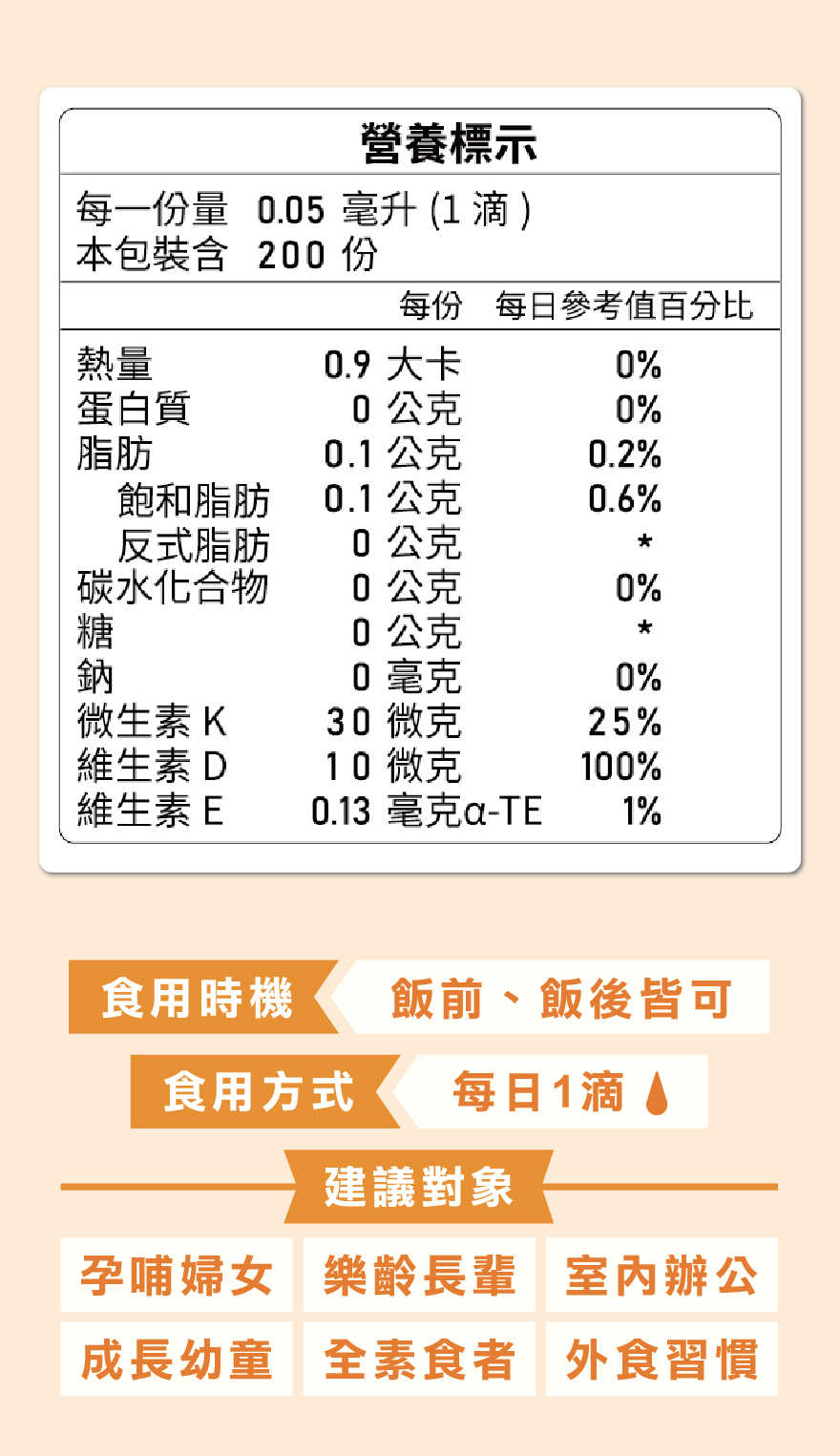 【產品成分】維生素D3、維生素K2【產品特點】◆1滴400IU,滿足每日所需◆全年齡、兒童、全素者皆可食用◆孕婦、備孕及哺乳期女性安心食用全素植物萃取來源選用FSC森林認證包裝【食用方式】每日1滴,建議飯前、飯後皆可食用
