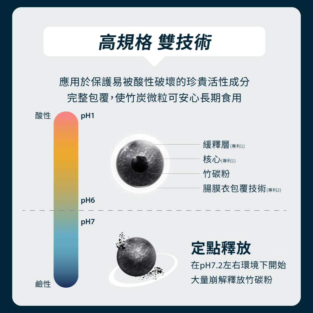 • 採日本穩定技術造就竹炭具多微孔體積特性• 嚴選高規格「雙重」專利劑型、專利包覆技術• 竹炭有超強吸附能力,幫助維持消化道機能,健康維持