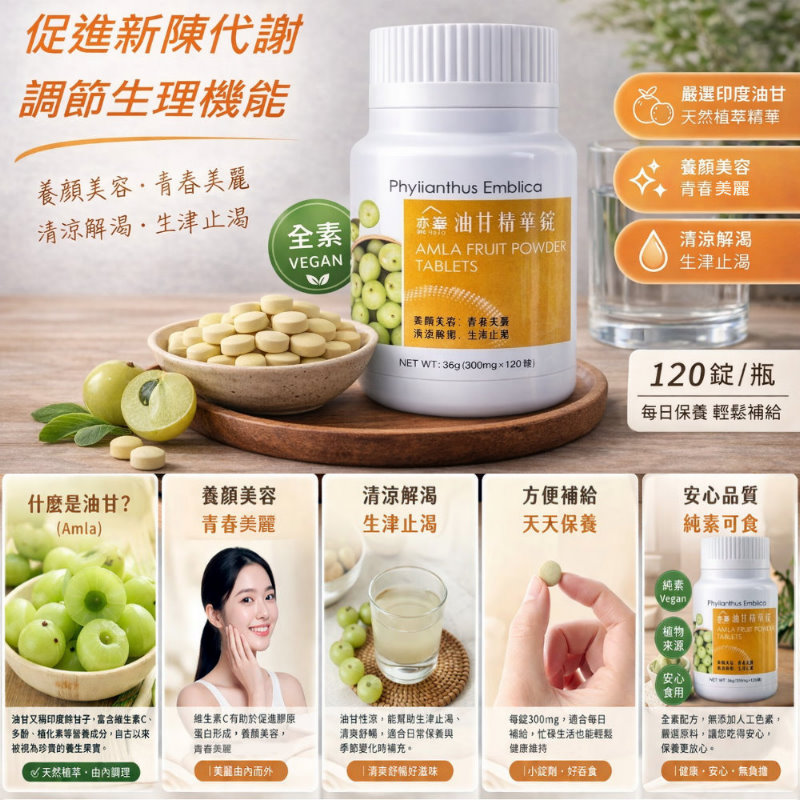 余甘子(印度聖果)~阿嬤級的超級水果!余甘子。別名:油甘、油甘果、油甘子、滇橄欖、餘甘果、餘柑子、牛甘、庵摩勒、庵摩落迦果。號稱:印度聖果、綠寶石。豐富維生素C、高含量SOD、含有18種胺基酸、膳食纖維、胡蘿蔔素、核黃素、維生素E、維生素B.等多種微量元素及礦物質、有機硒。本品添加了珍貴的卡姆果萃取物~調整體質、調節生理機能、增強體力、維生素C、養顏美容、營養補給、膳食纖維※全素可食,素食者的最佳營養補給!