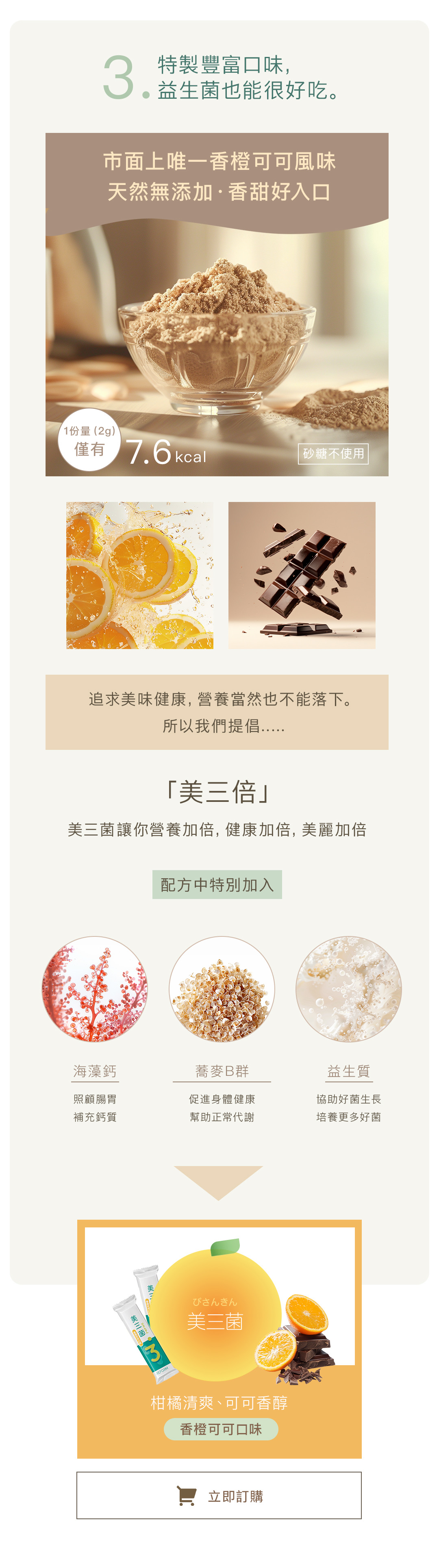 採用益生質、蕎麥B群及海藻鈣,組成+3完美組合