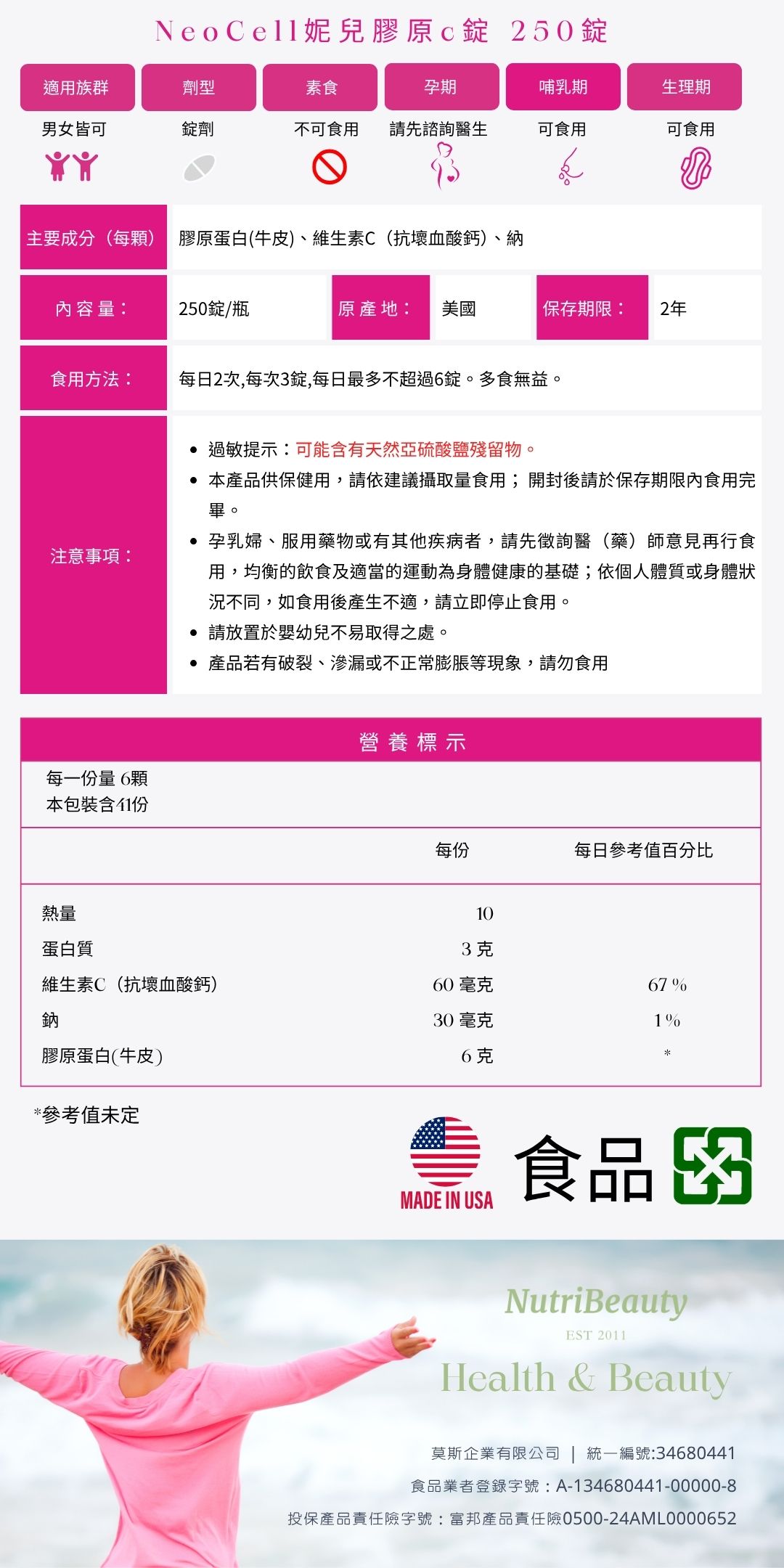 每一份量 6 錠 項目 每份 每日參考值% 熱量 20 大卡 1% 蛋白質 5 克 10% 維生素 C 60 毫克 60% 鈉 30 毫克 1% 膠原蛋白肽(牛皮) 6000 毫克 *