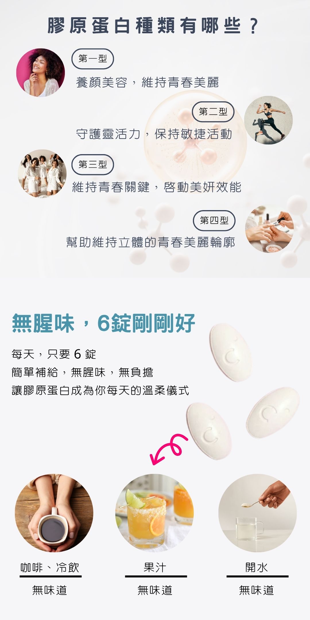 此型態的膠原蛋白勝肽可溶解於冷、熱液體中,較容易融入日常飲食補充中。在營養補充品中,你可能會看到「膠原蛋白勝肽」、「水解膠原蛋白」或「膠原蛋白水解物」等名稱,這些皆表示已分解為較小分子的型態,適合作為日常營養補充選擇。