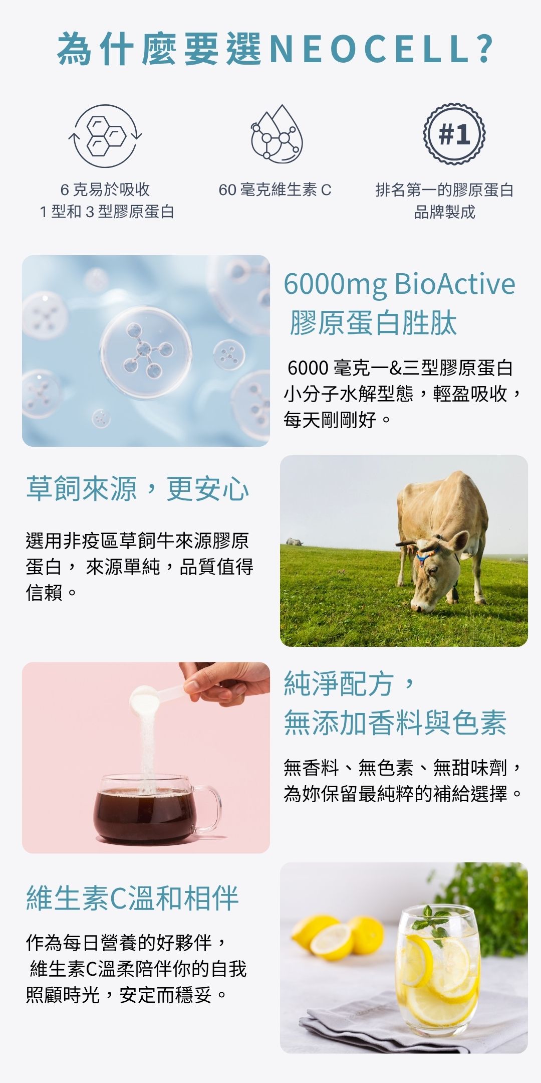 嚴選草飼牛來源,每份提供 6000 毫克 BioActive NeoCell® 膠原蛋白胜肽™。搭配維他命 C,錠劑設計讓每日補給更簡單、更好持續。