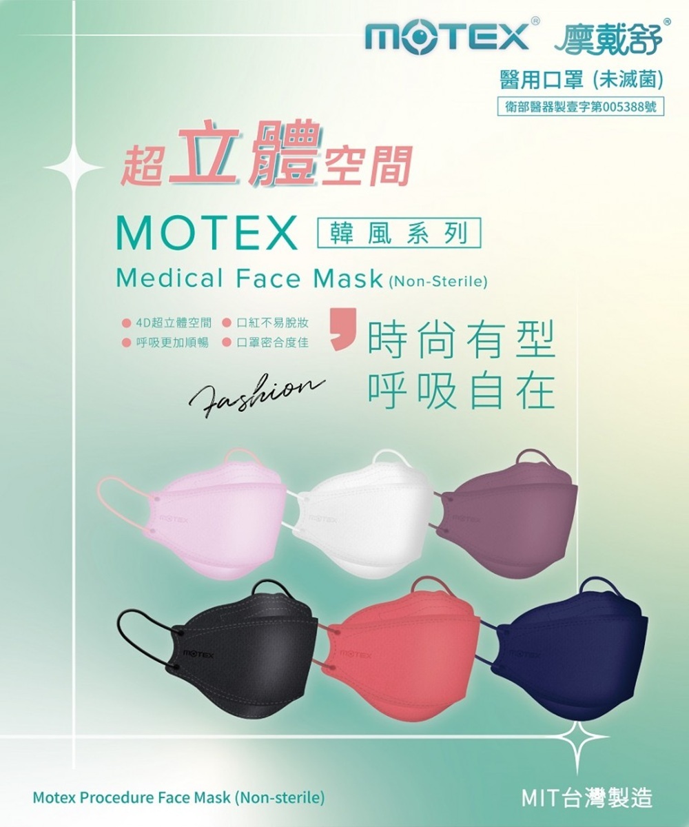 4D折疊型超立體空間設計,佩戴便利口罩密合度佳,呼吸更加順暢,口紅不易脫妝1、商品組合/規格:【MOTEX 摩戴舒】立體型櫻花粉10片/盒2、醫療器材許可證◆核定品名:摩戴舒醫用口罩 (未滅菌)◆核准字號:衛部醫器製壹字第005388號◆藥商名稱:華新橡膠工業股份有限公司◆製造廠名稱:宣德醫材科技股份有限公司工廠◆製造廠地址:彰化縣田中鎮酪農路268號3、藥商許可執照◆醫材許可執照字號:中市醫材販 字第 MD6203022382 號◆藥商名稱:佑全藥品股份有限公司◆藥商地址:台中市西屯區福和里台灣大道四段925號20樓之1◆諮詢專線電話:0800-046-111 / 0800-557-6884、製造日期:詳見商品包裝標示及說明5、有效期間或保存期限:詳見商品包裝標示及說明6、具量測功能之產品:無7、醫療器材廣告核准字號:衛部器廣字第11110005號8、「消費者使用前應詳閱產品說明書」備註欄:無