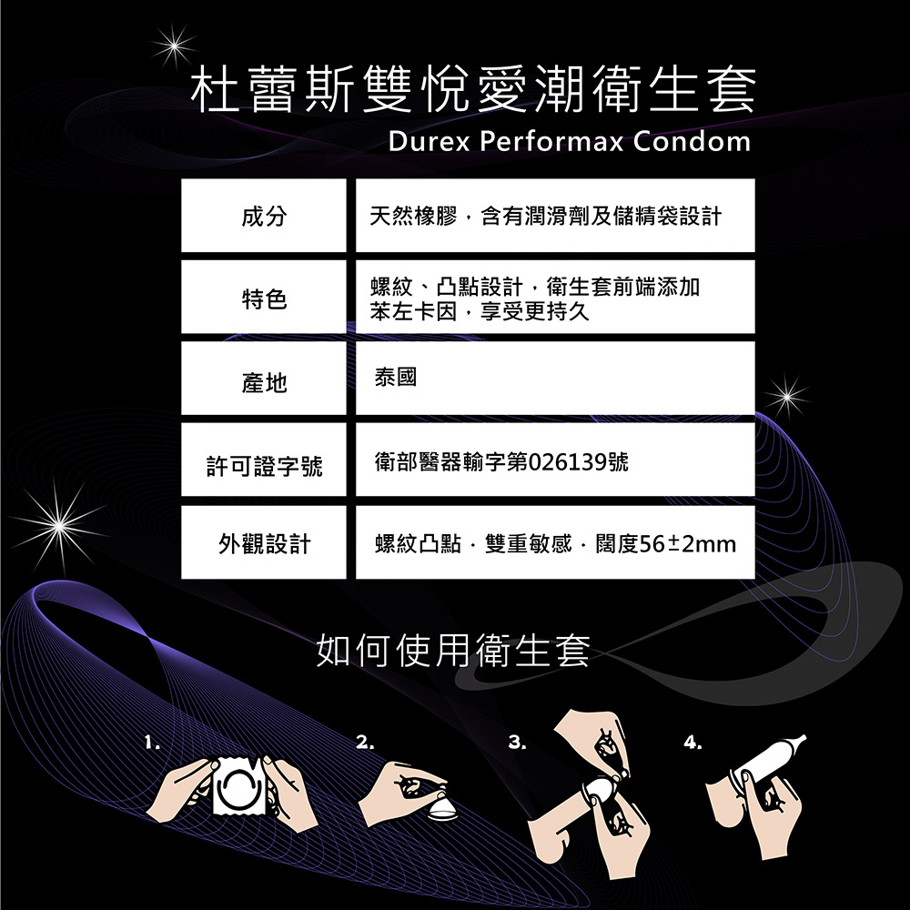 本產品為一次性用途,用完請丟棄勿再重複使用。本產品乃針對陰道性交設計,若使用於非陰道性交時,滑落或破損的機率會提高。目前任何一種保險套皆不能100%有效避孕及預防感染性病及愛滋病。本產品原料為天然橡膠製成之乳膠,對乳膠過敏者, 請避免使用。