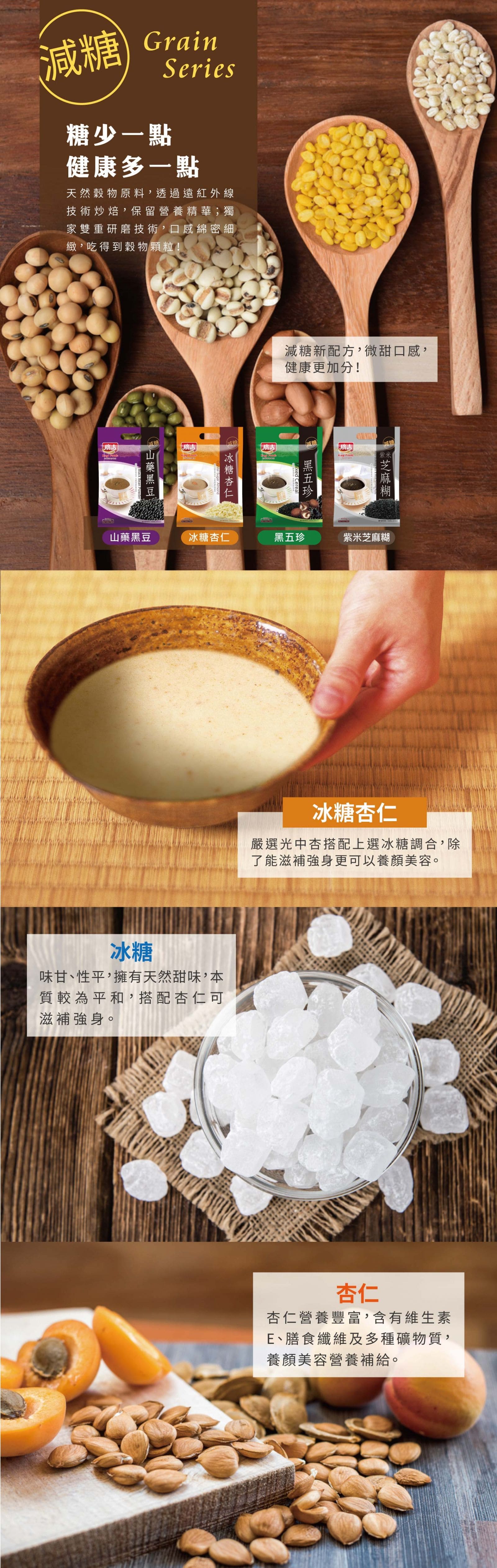 綜合穀物堅果粉(燕麥、杏仁、黃豆(非基因改造)、薏仁、花生、大麥、玉米(非基因改造)、米豆、花豆、高粱、蕎麥、糙米、糯小米、紅豆、南瓜子、葵瓜子、蓮子、山藥)、奶精(葡萄糖漿、完全氫化棕櫚仁油、乾酪素鈉、檸檬酸鉀、脂肪酸甘油酯、二氧化矽、婀娜多色素)、砂糖、香料、葡萄糖、關華豆膠、冰糖、碳酸鈣