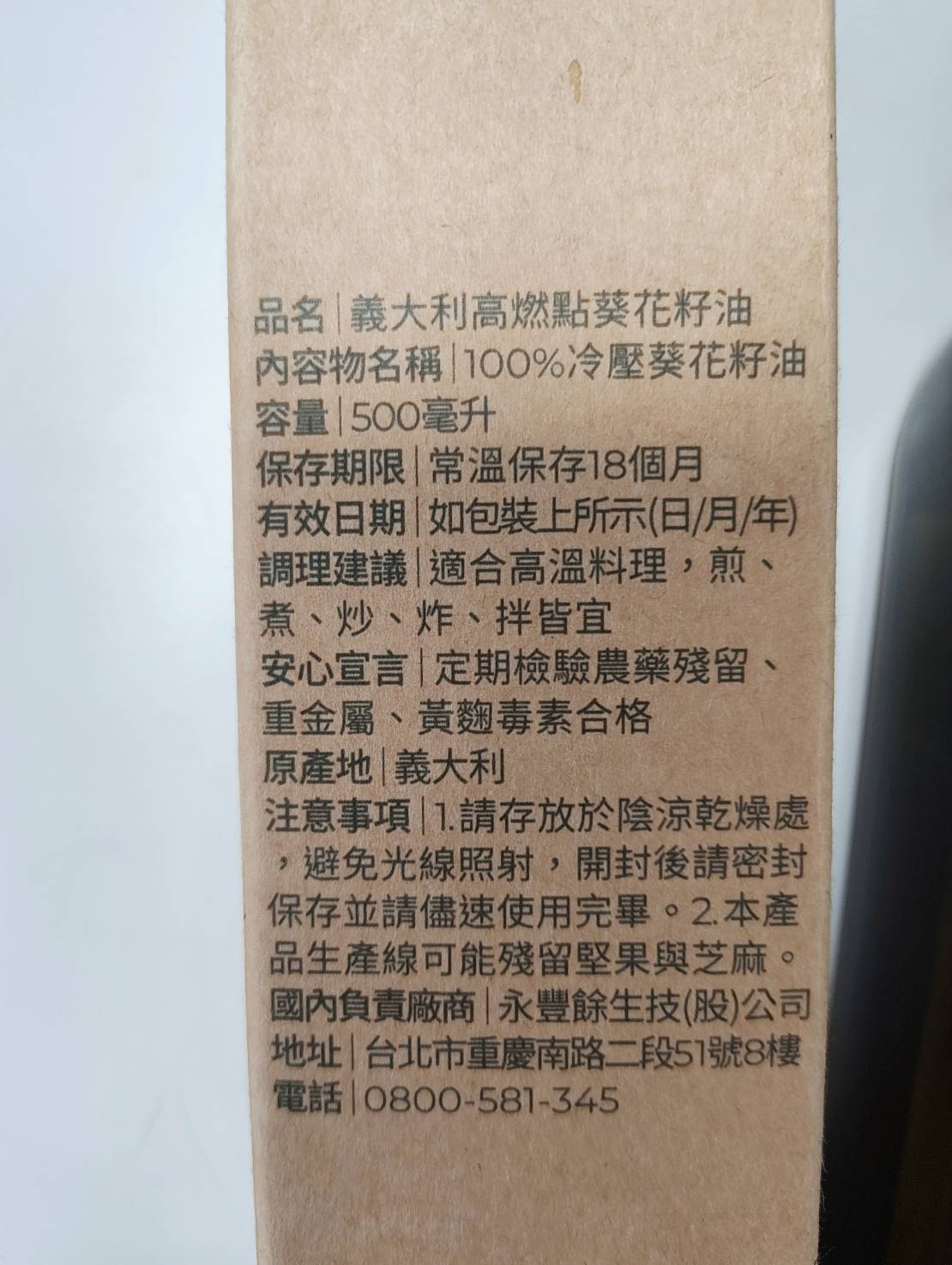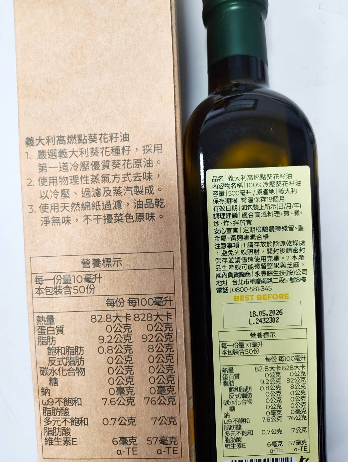 惜福專案,買1送1賞味期:2026年5月18日1. 嚴選義大利葵花種籽,採用第一道冷壓優質葵花原油。