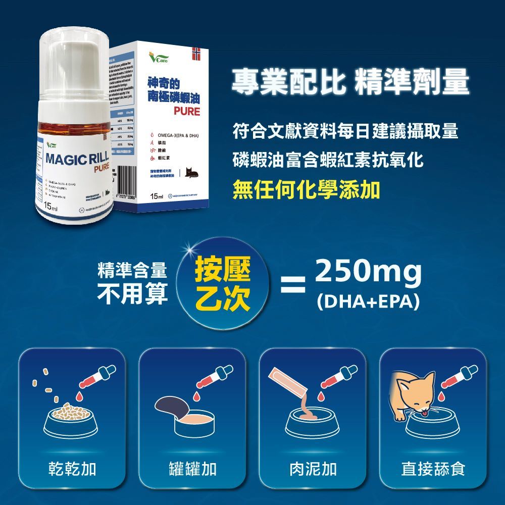 南極磷蝦富含天然抗氧化劑 - 蝦紅素,維持整罐不氧化,無需做成膠囊,直接按壓,方便餵食!不會氧化堵住瓶口