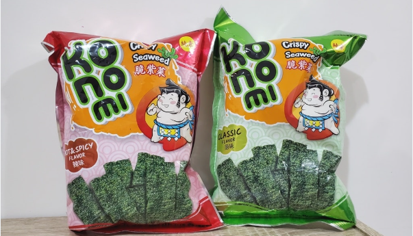脆紫菜-原味 成分: 紫菜、米糠油、調味粉(糖、麥芽糊精、紫菜香料[棕櫚油、香料(含花生、椰子來源)]、海苔片(紫菜)、 調味劑(5'-鳥嘌呤核苷磷酸二鈉、5'-次黃嘌呤核苷磷酸二鈉)、食鹽)。 脆紫菜-辣味 成分: 紫菜、米糠油、香辣調味粉(糖、辣椒、麥芽糊精、紫菜香料[棕櫚油、香料(含花生、椰子來源)]、食鹽、海苔片(紫菜)、 調味劑(5'-鳥嘌呤核苷磷酸二鈉、5'-次黃嘌呤核苷磷酸二鈉))