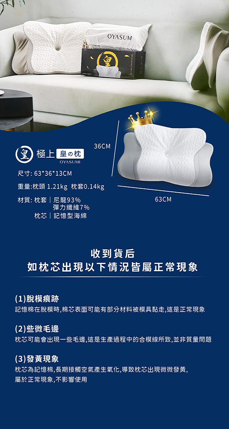 品名:【Pure Sleep】嘖嘖爆款-OYASUMI極上皇の枕枕芯:記憶型海綿面料材質:93%尼龍、7%彈力纖維適合族群:成年人、青少年尺寸:63*36*13CM重量:1.21kg產地:中國(台灣監製)代理商:茂榕數位科技有限公司地址:桃園市平鎮區廣東路57巷1號電話:0800-666865《夢遊.Oyasumi》台灣獨家代理※此商品為睡眠使用之枕芯外布套僅供保護填充物,非供直接使用,不可拆卸使用時須另加枕頭套※注意! 枕芯屬於個人衛生用品,如經拆封或使用,概不接受退換貨,購買使用前請特別留意!※尺寸均為人工測量,若誤差在2CM以內純屬合理範圍,完美主義者請謹慎下單,最終請以實體為準。※商品為真空包裝,收到後若無法立刻成原狀,可以輕拍揉捏枕芯數下,再放置一下即會恢復原狀。